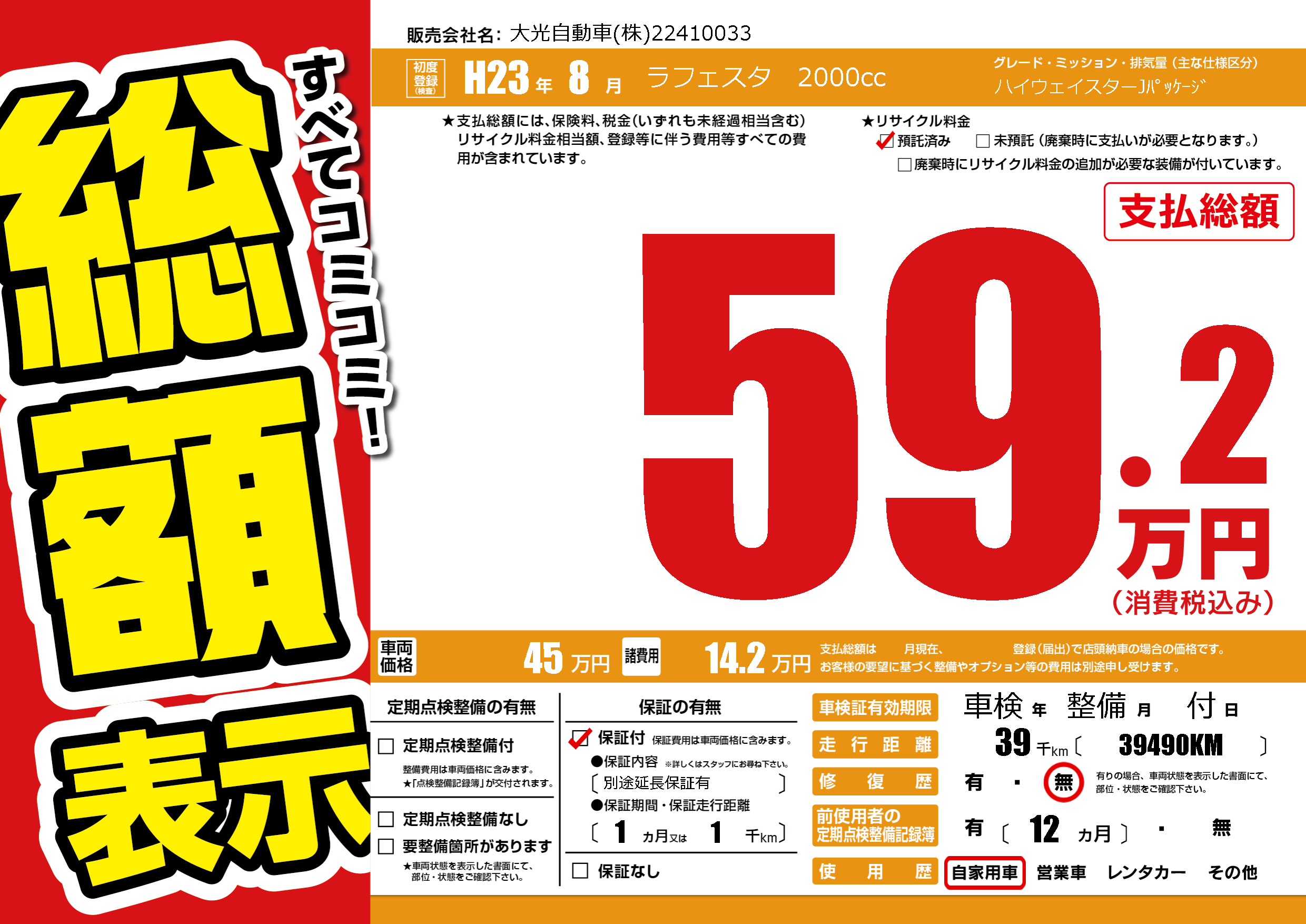 | 走行キロ | 3.9万km | 初年度登録 | H23年8月 |
