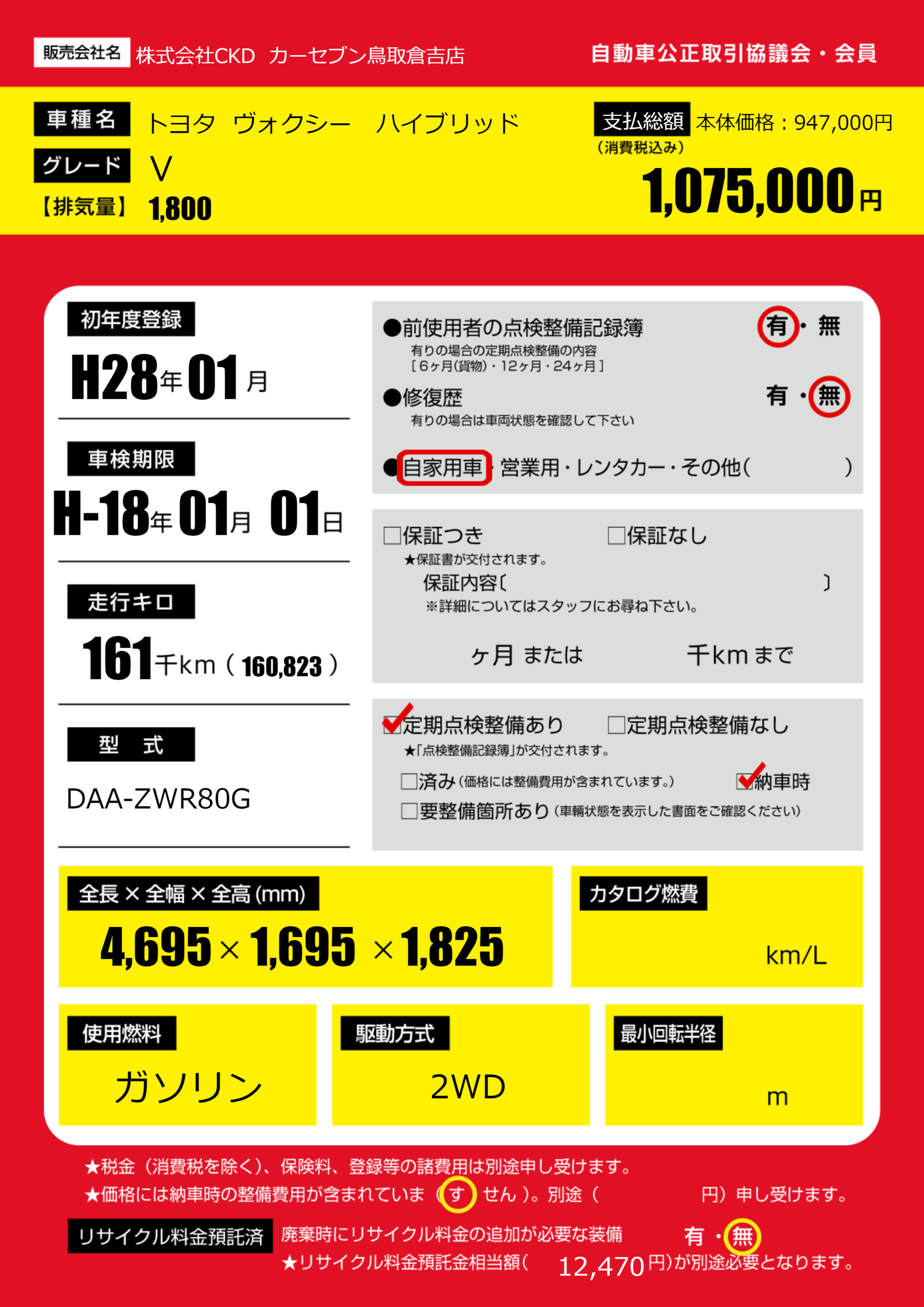 | 車名 | トヨタ ヴォクシー ハイブリッド | グレード ミッション 排気量 |