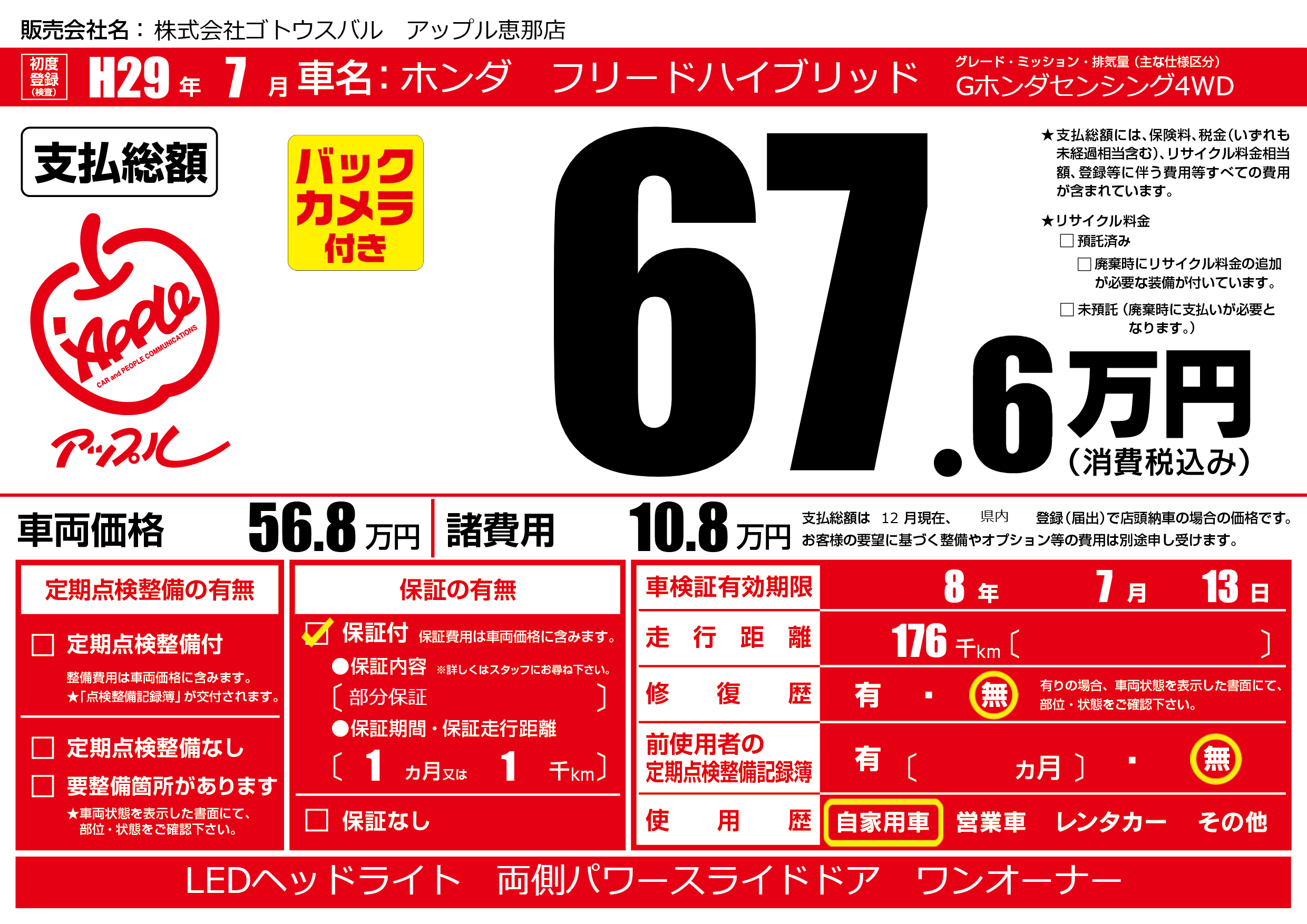 | 車名 | ホンダ フリードハイブリッド | グレード ミッション 排気量 |