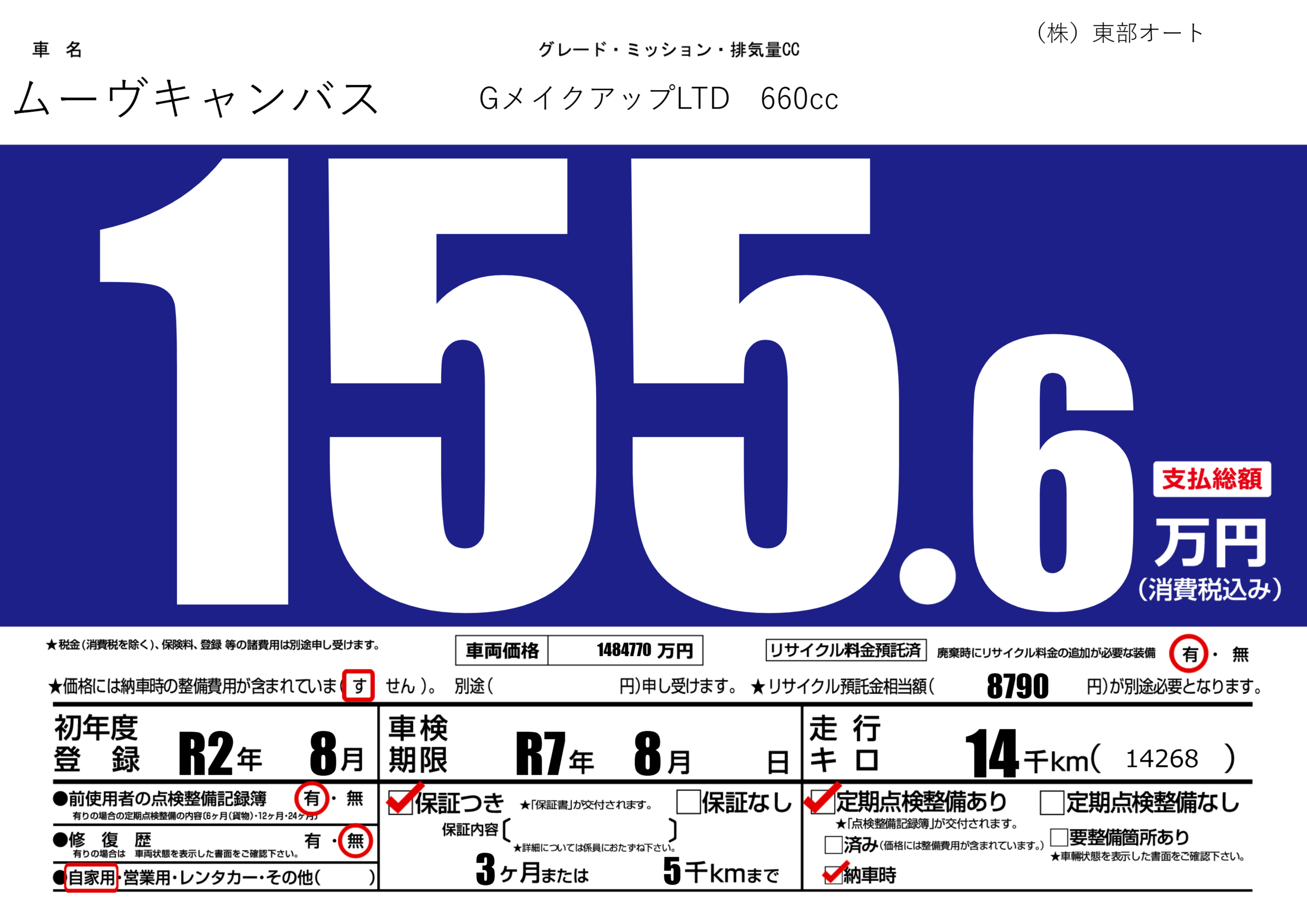 保証付き 保証内容(---) 3ヶ月または(5)千kmまで |