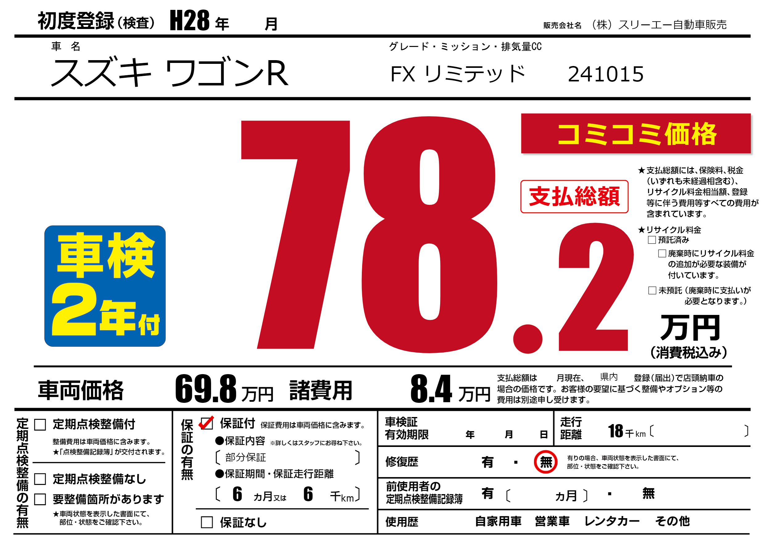 | 車名 | スズキ ワゴンR | グレード ミッション 排気量 |