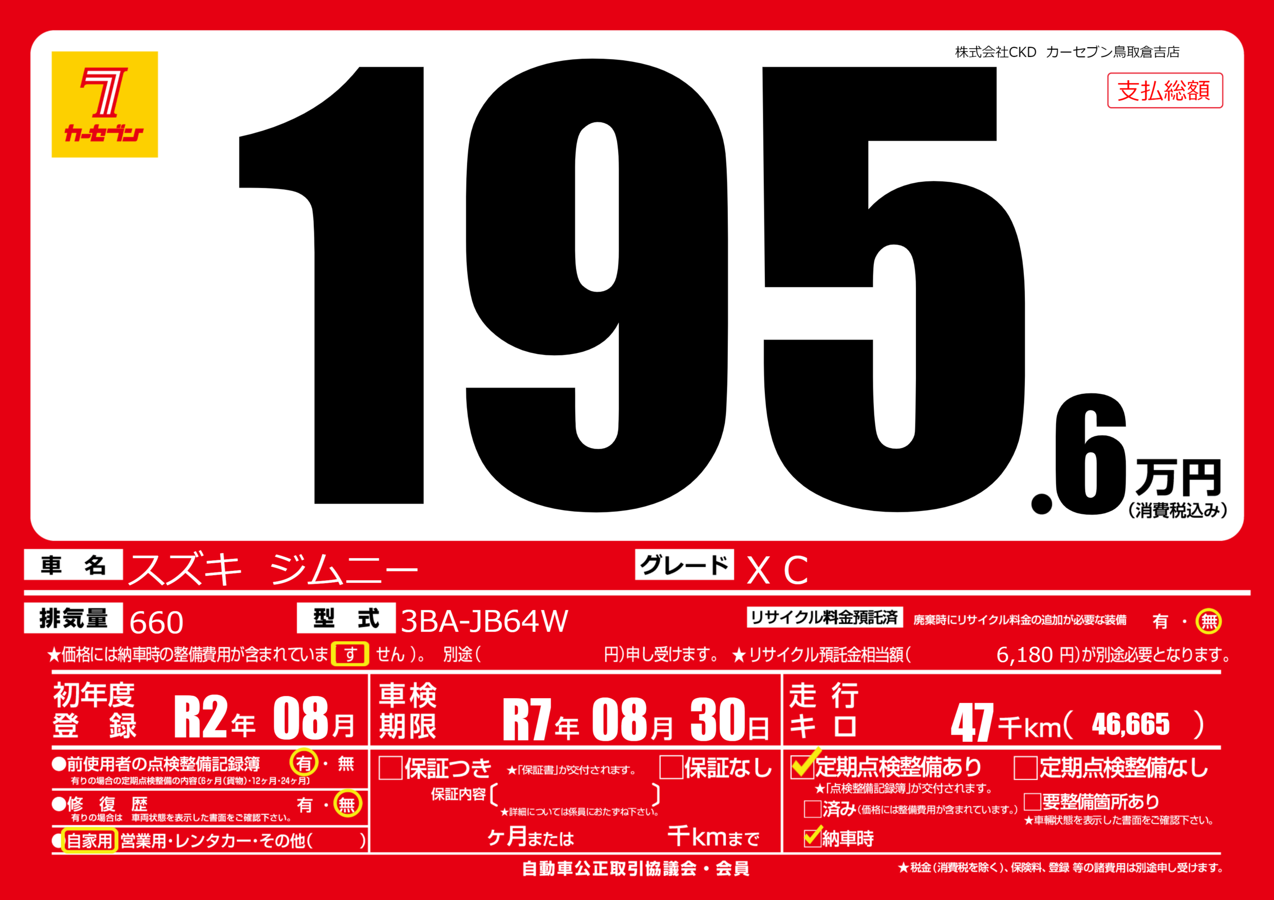| 走行キロ | 4.7万km | 初年度登録 | R2年08月 |