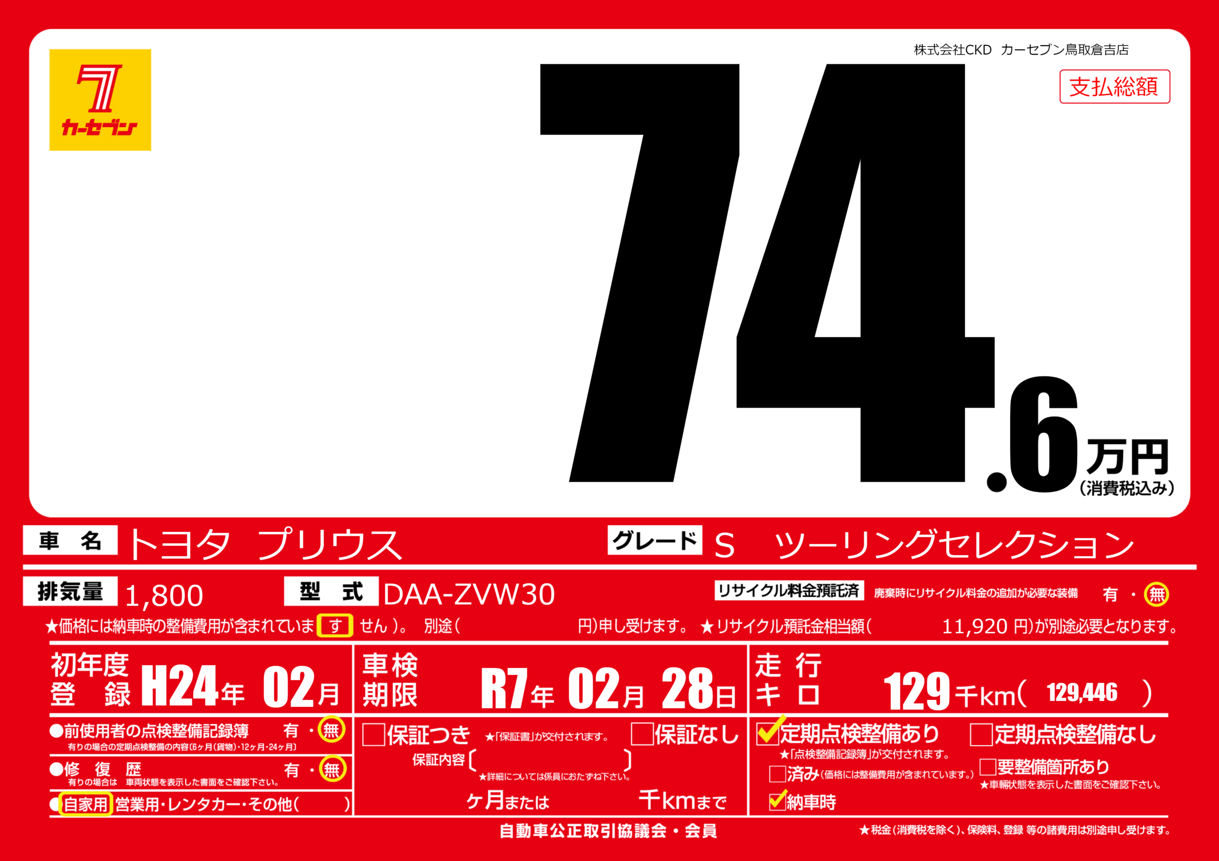 | 走行キロ | 12.9万km | 初年度登録 | H24年02月 |