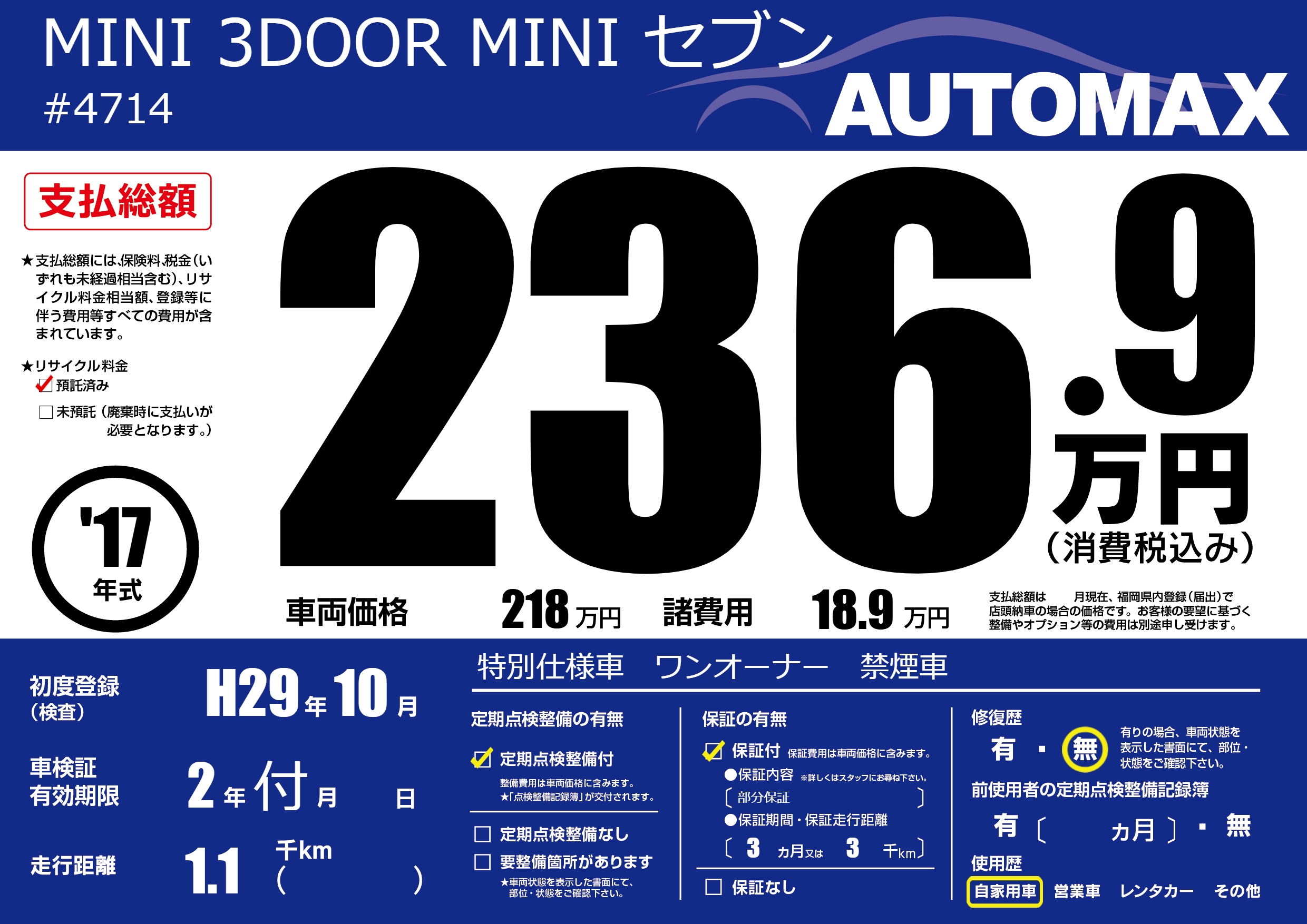 | 車名 | MINI 3DOOR MINI セブン | グレード ミッション 排気量 |