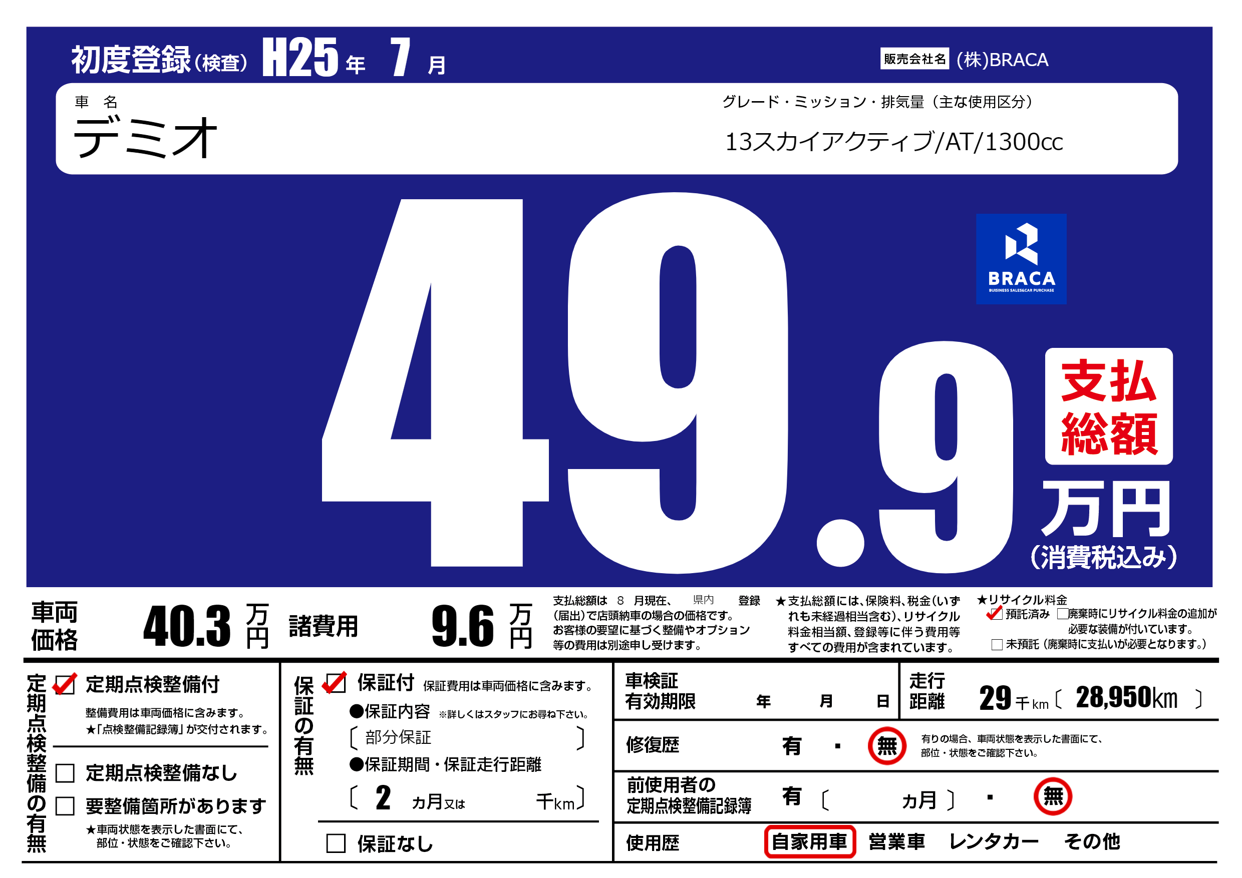 | 走行キロ | 2.9万km | 初年度登録 | H25年7月 |