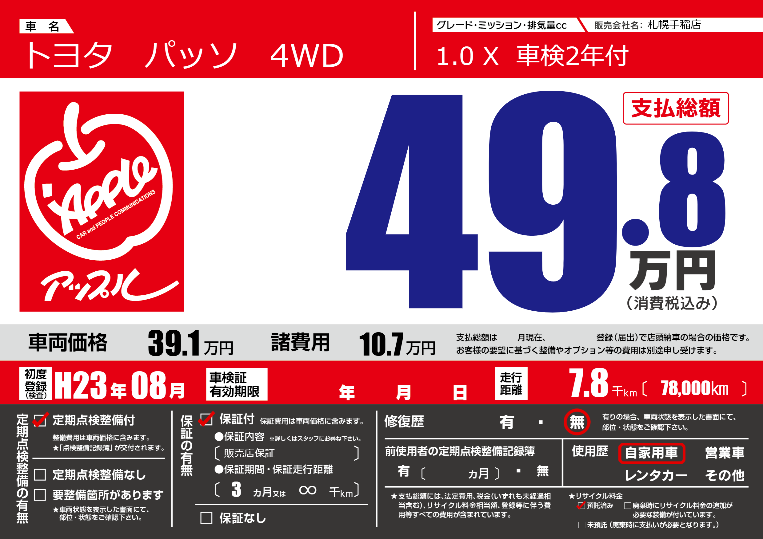 | 車名 | トヨタ パッソ 4WD | グレード ミッション 排気量 |