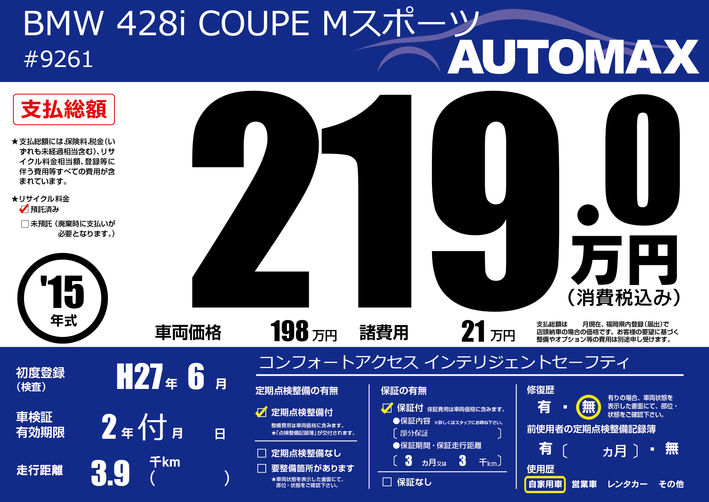 | 車名 | BMW 428i COUPE Mスポーツ | グレード ミッション 排気量 |