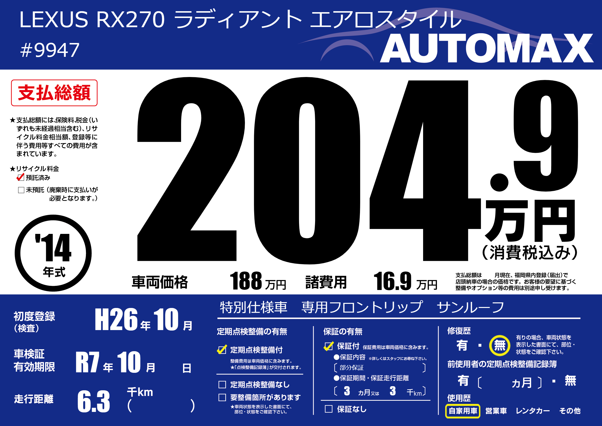 | 車名 | LEXUS RX270 ラディアント エアロスタイル | グレード ミッション 排気量 |