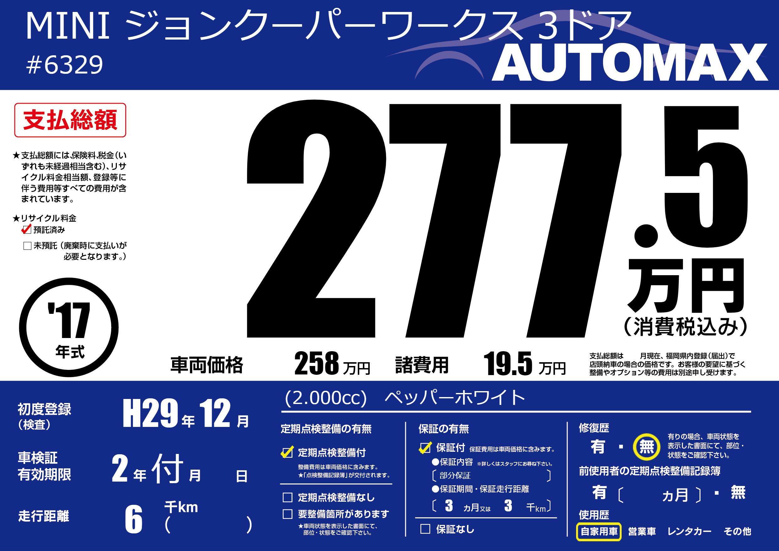 | 車名 | MINI ジョンクーパーワークス 3ドア | グレード ミッション 排気量 |