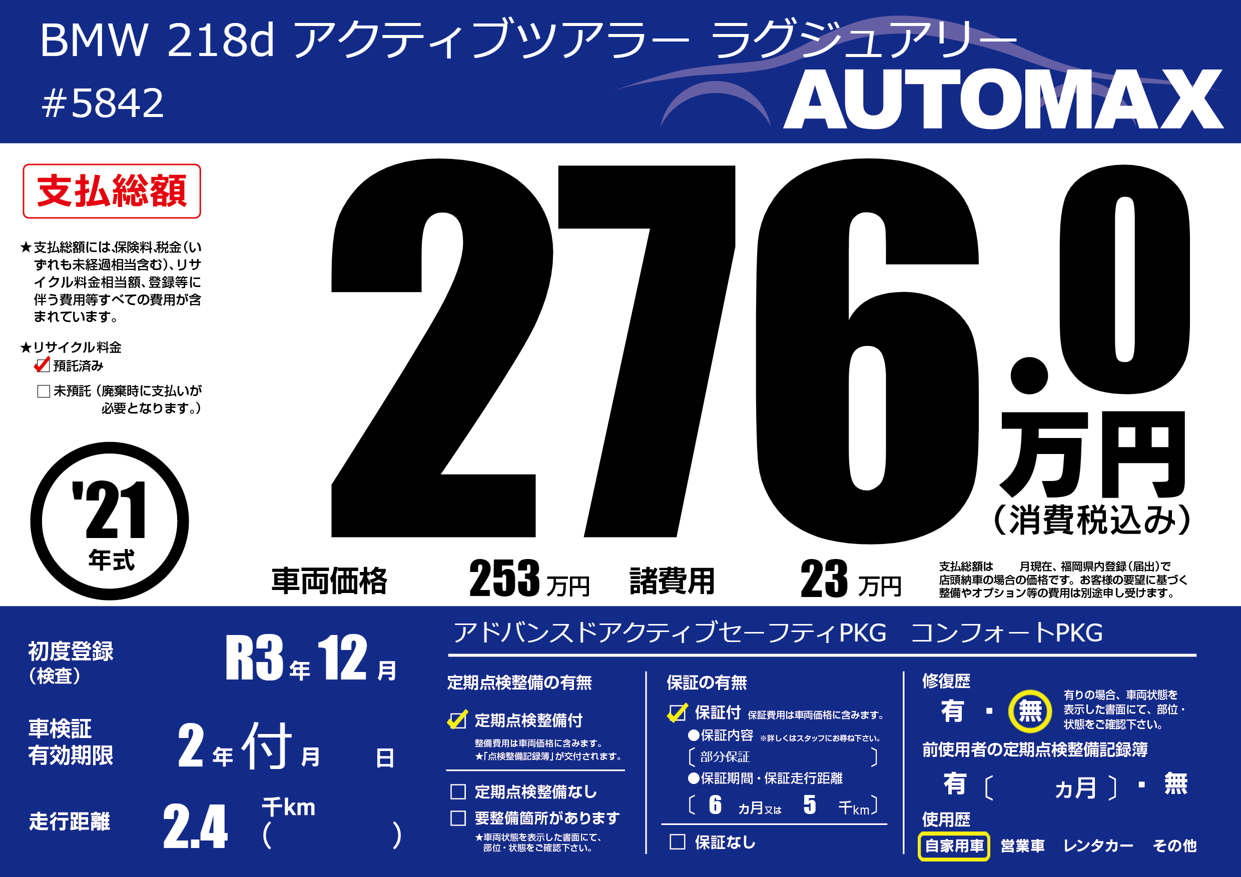 | 車名 | BMW 218d アクティブツアラー ラグジュアリー | グレード ミッション 排気量 |