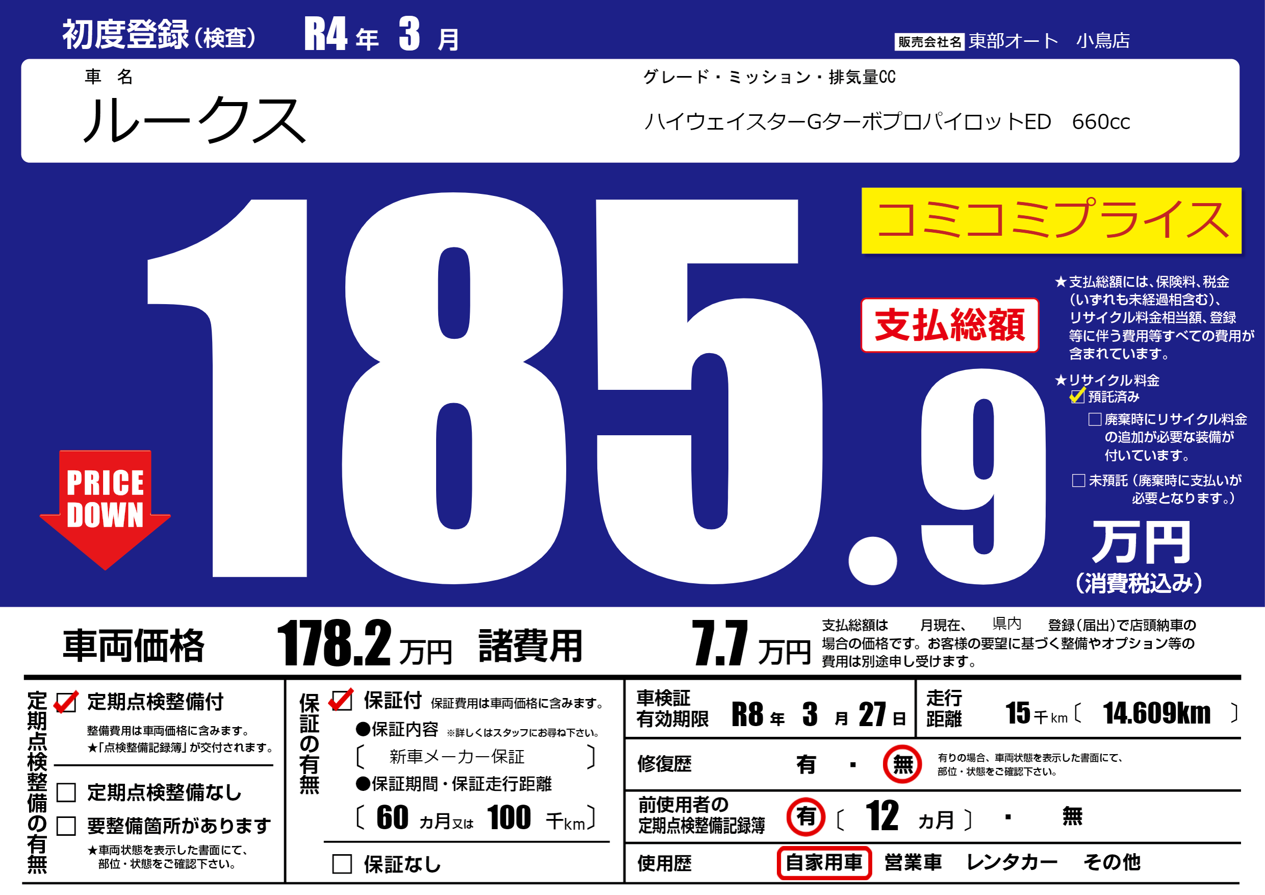 | 走行キロ | 1.5万km | 初年度登録 | R4年3月 |