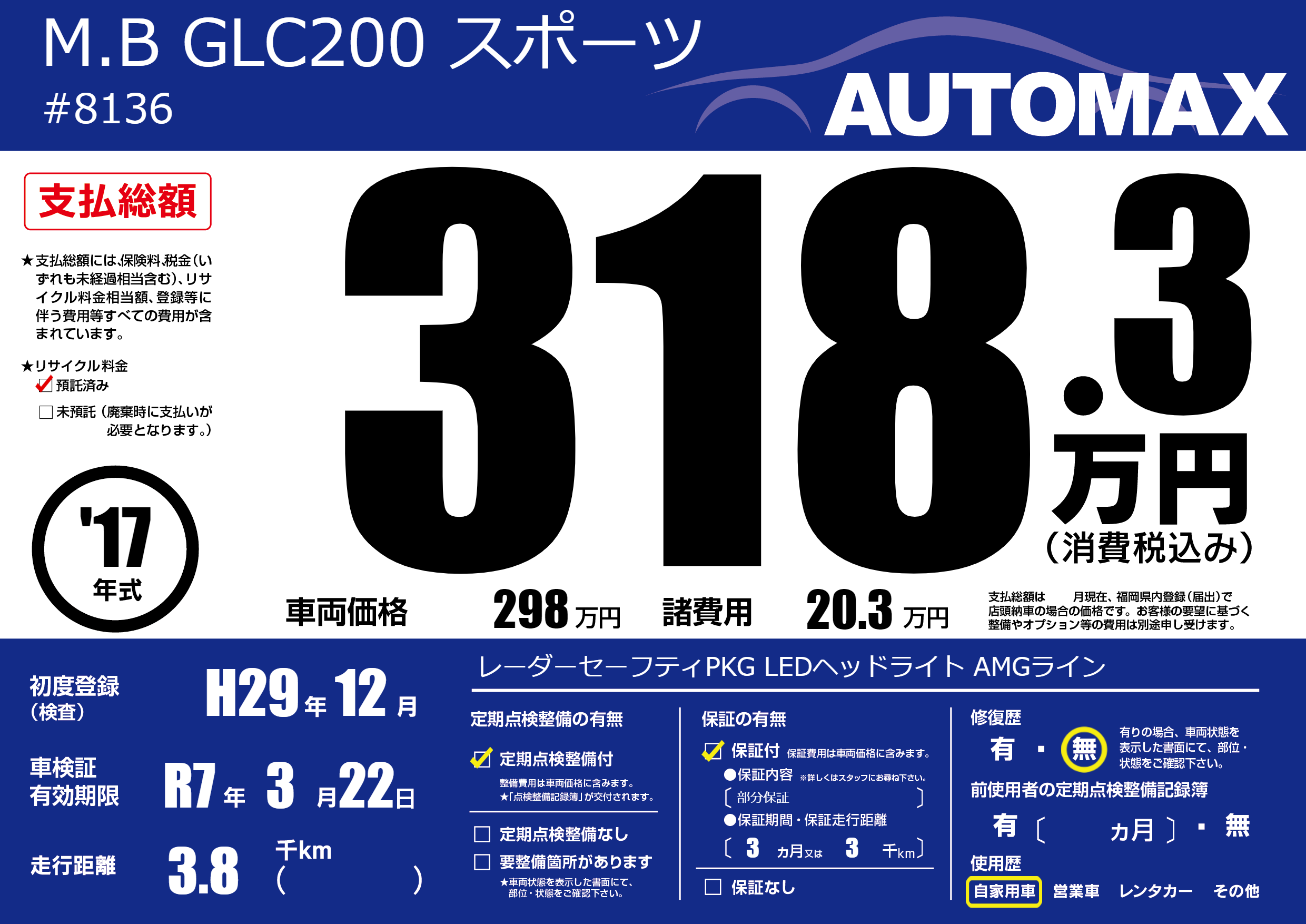 | 車名 | M.B GLC200 スポーツ | グレード ミッション 排気量 |
