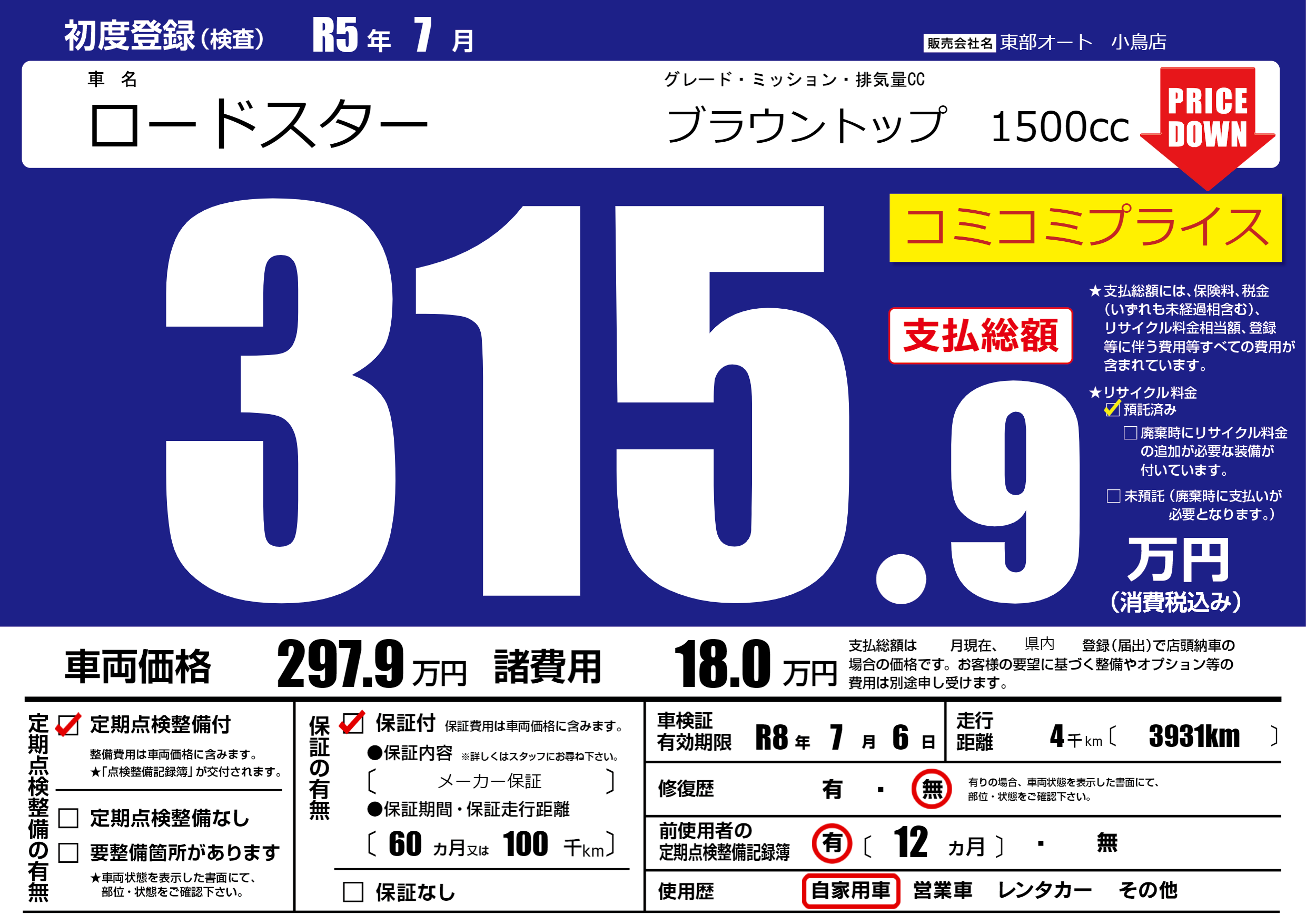 | 走行キロ | 0.4万km | 初年度登録 | R5年7月 |