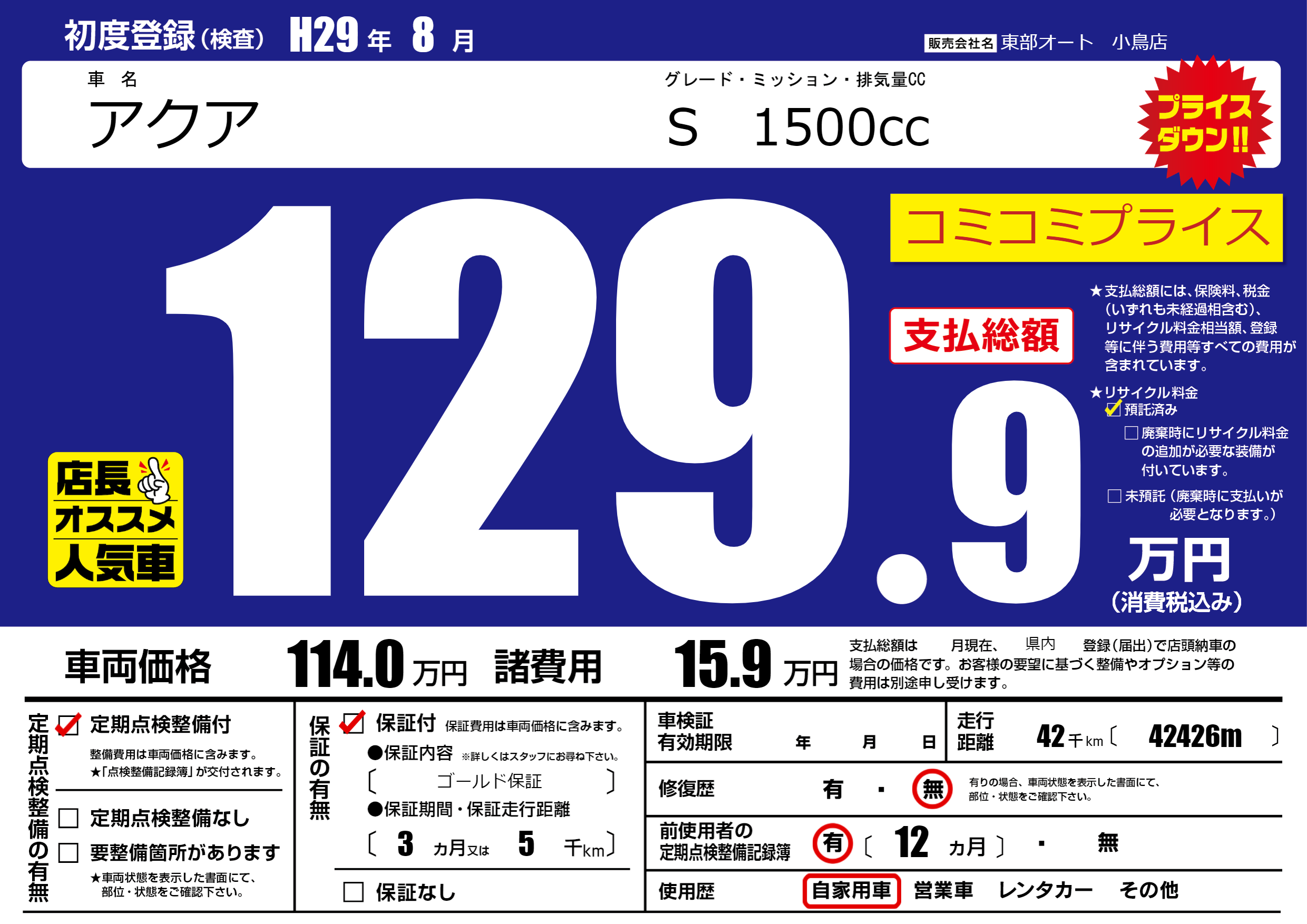 | 走行キロ | 4.2万km | 初年度登録 | H29年8月 |