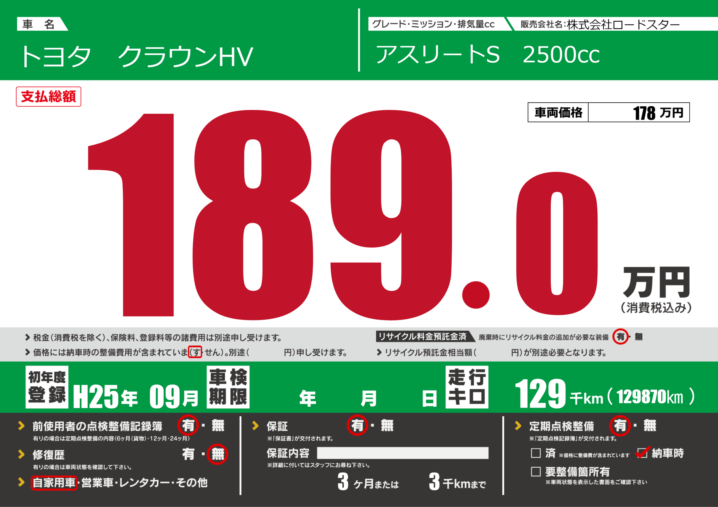 | 車名 | トヨタ クラウンHV | グレード ミッション 排気量 |