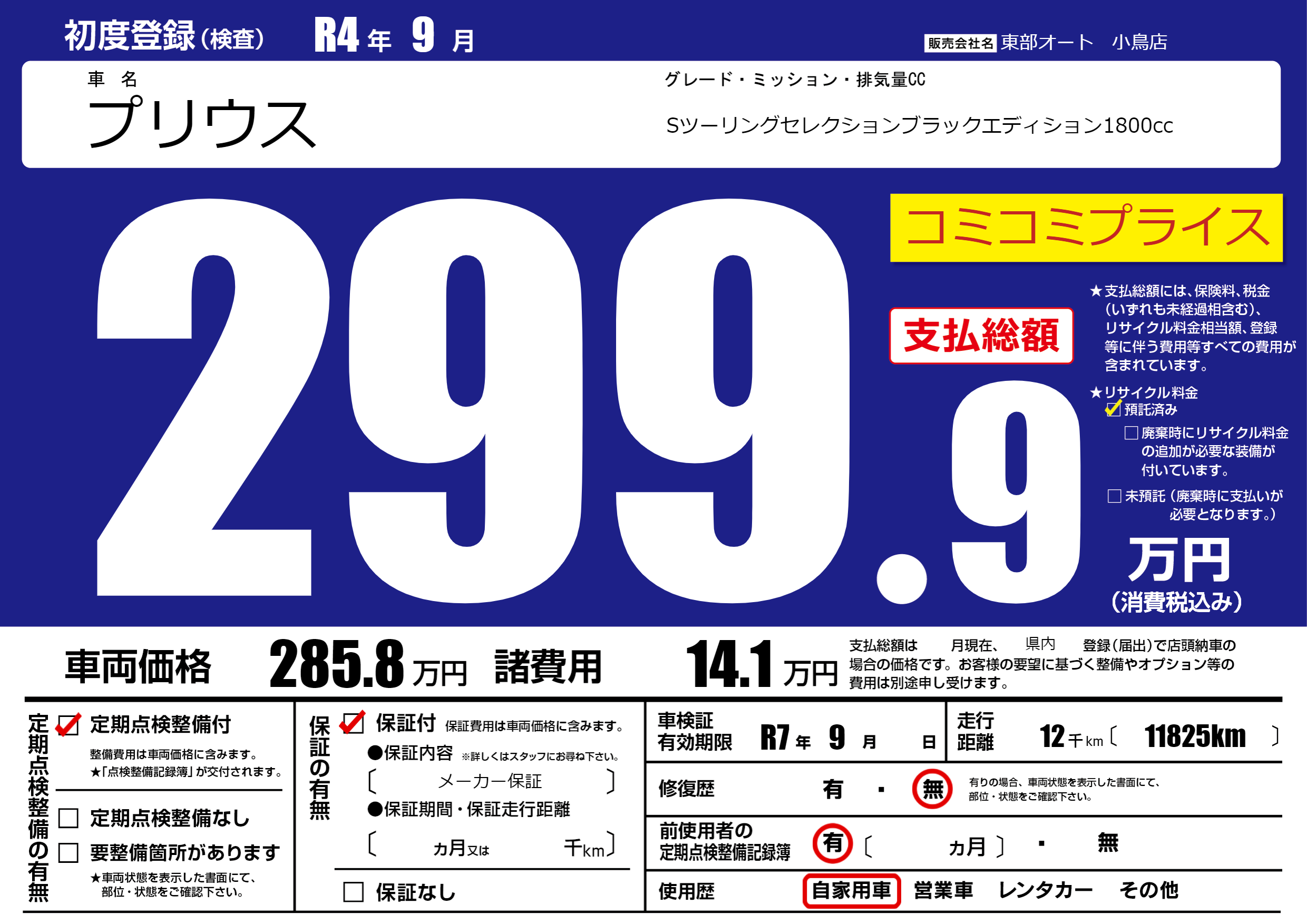 | 車名 | プリウス | グレード ミッション 排気量 |