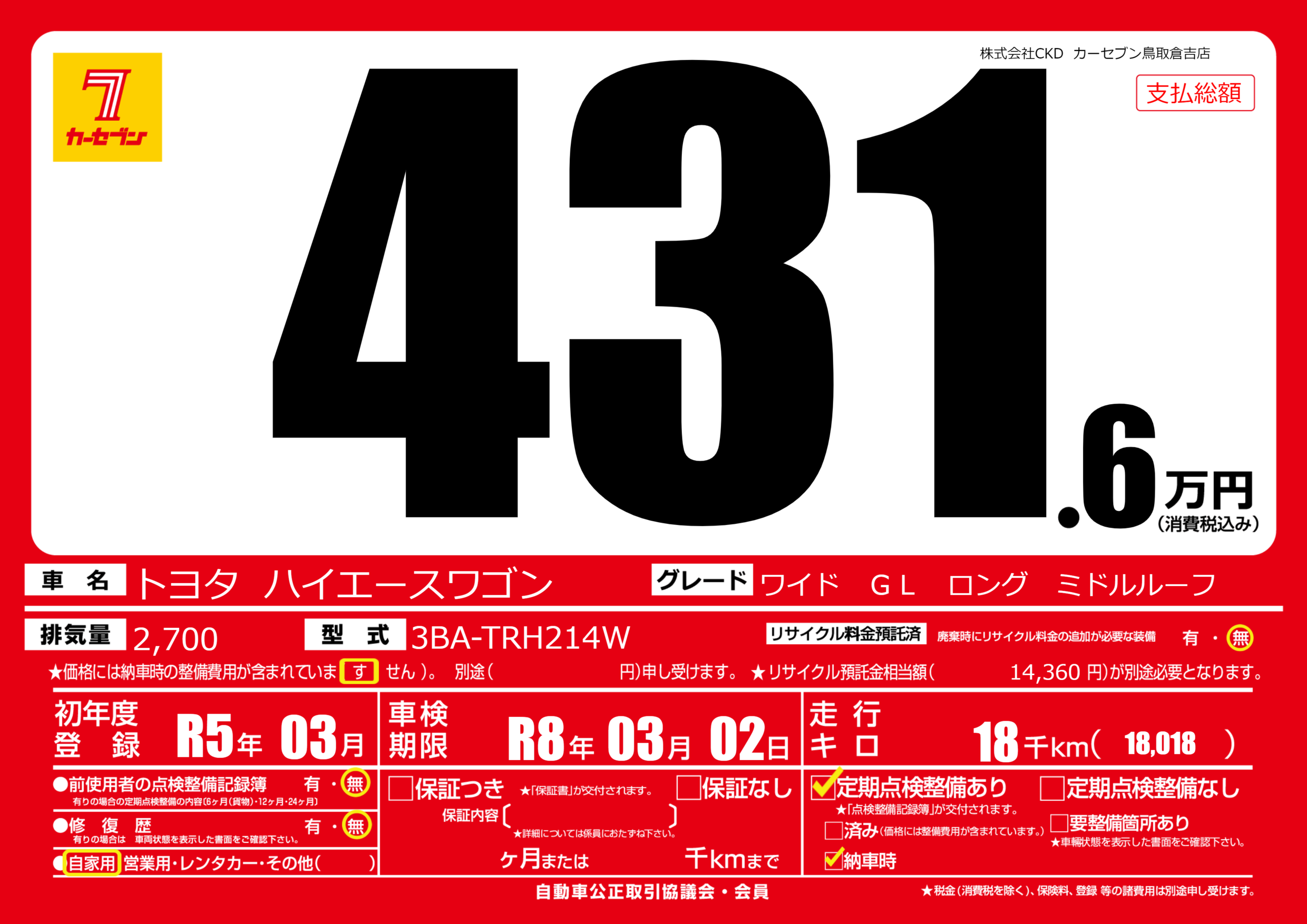 | 定期点検整備 | 定期点検整備あり 納車時あり | ||