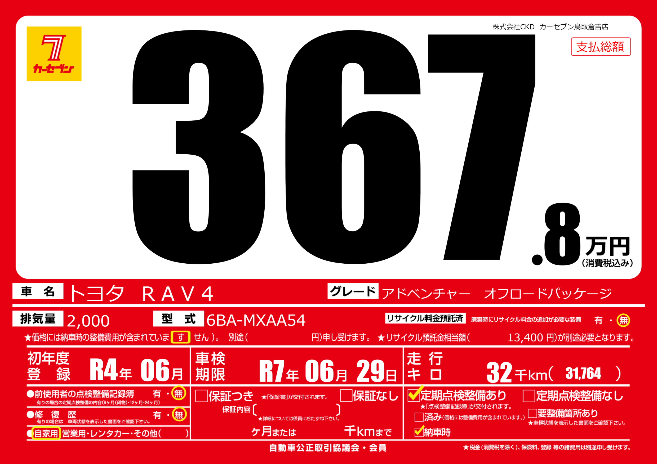 | 車名 | トヨタ RAV4 | グレード ミッション 排気量 |