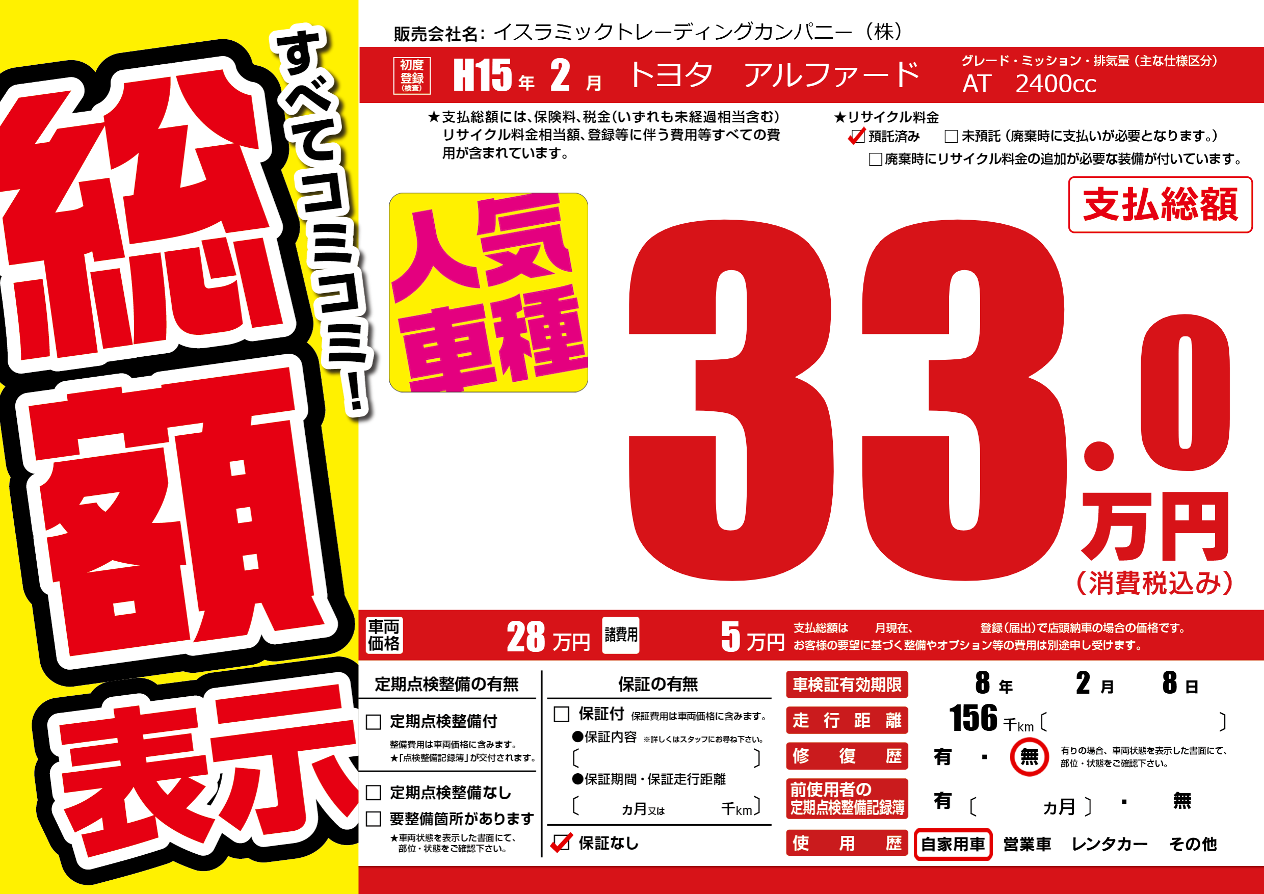 | 車名 | トヨタ アルファード | グレード ミッション 排気量 |