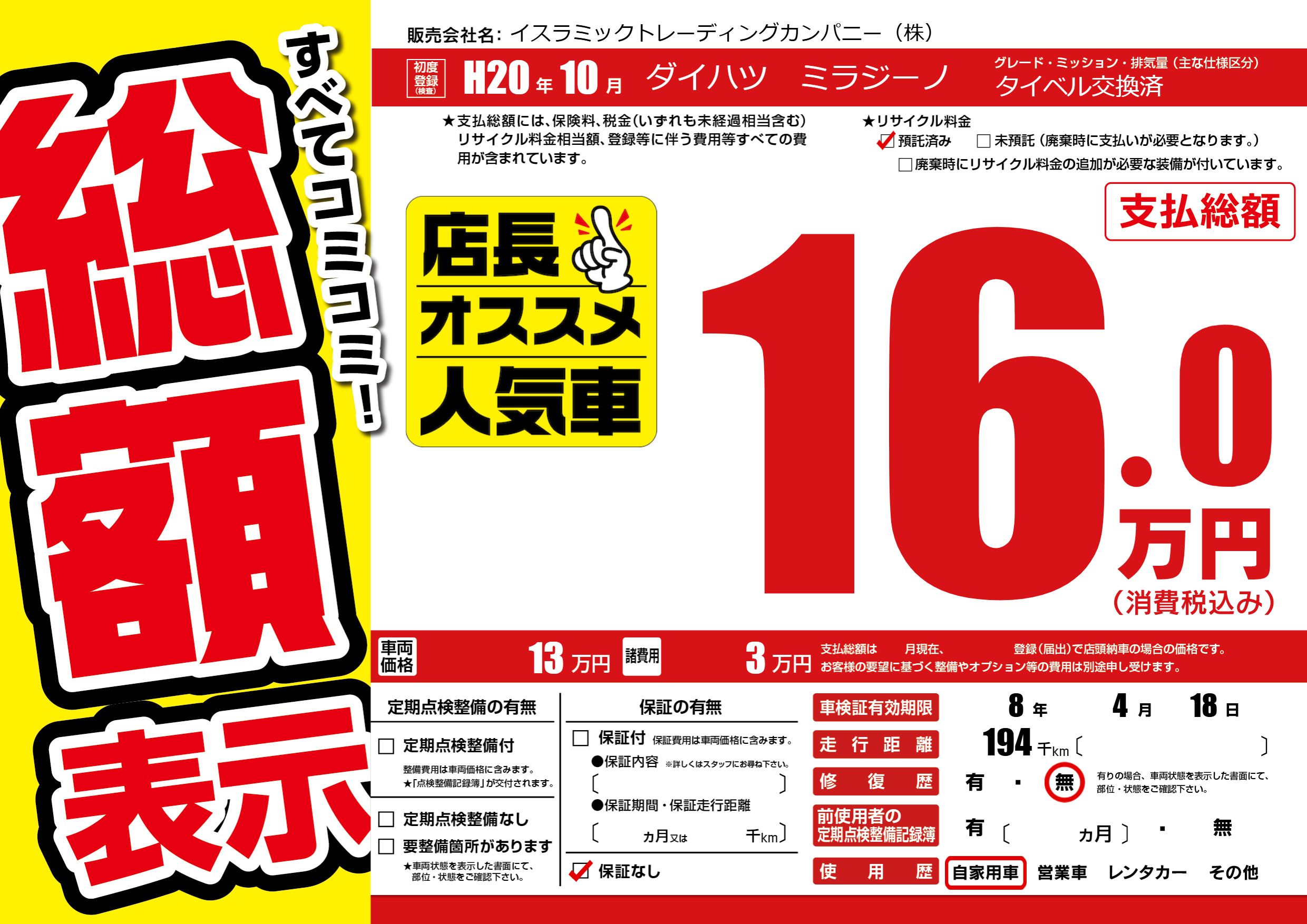 | 走行キロ | 19.4万km | 初年度登録 | H20年10月 |