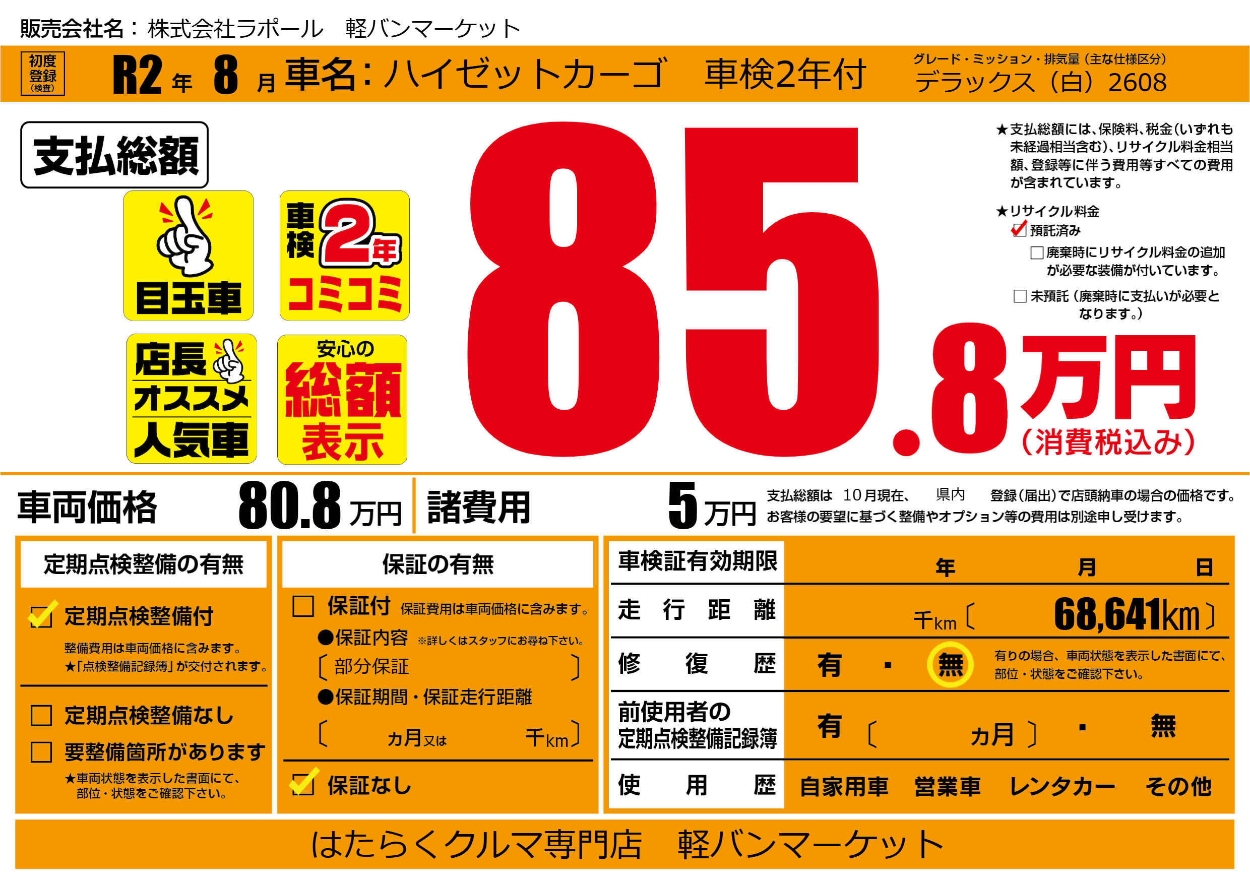 | 車名 | ハイゼットカーゴ 車検2年付 | グレード ミッション 排気量 |