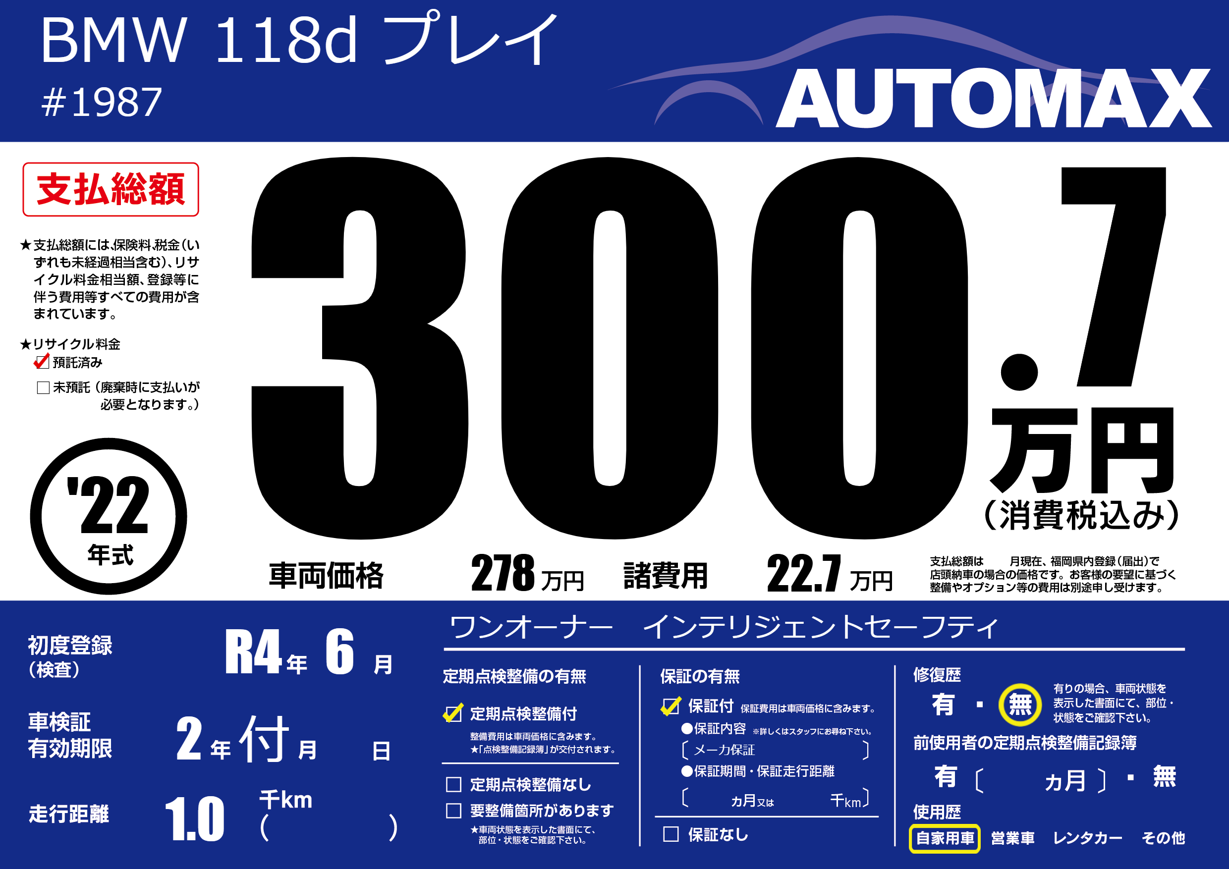 | 車名 | BMW 118d プレイ | グレード ミッション 排気量 |