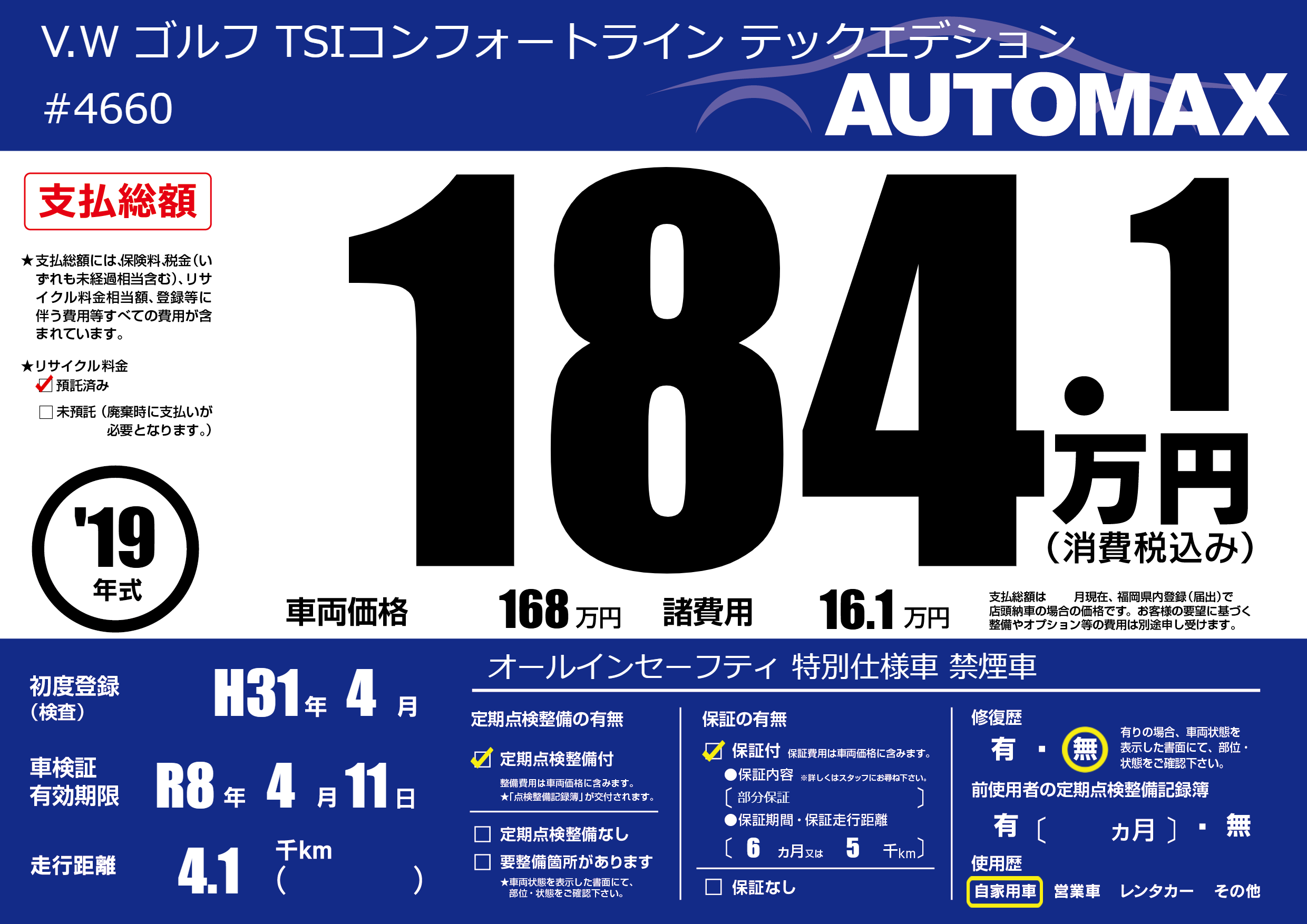 | 車名 | V.W ゴルフ TSIコンフォートライン テックエデション | グレード ミッション 排気量 |