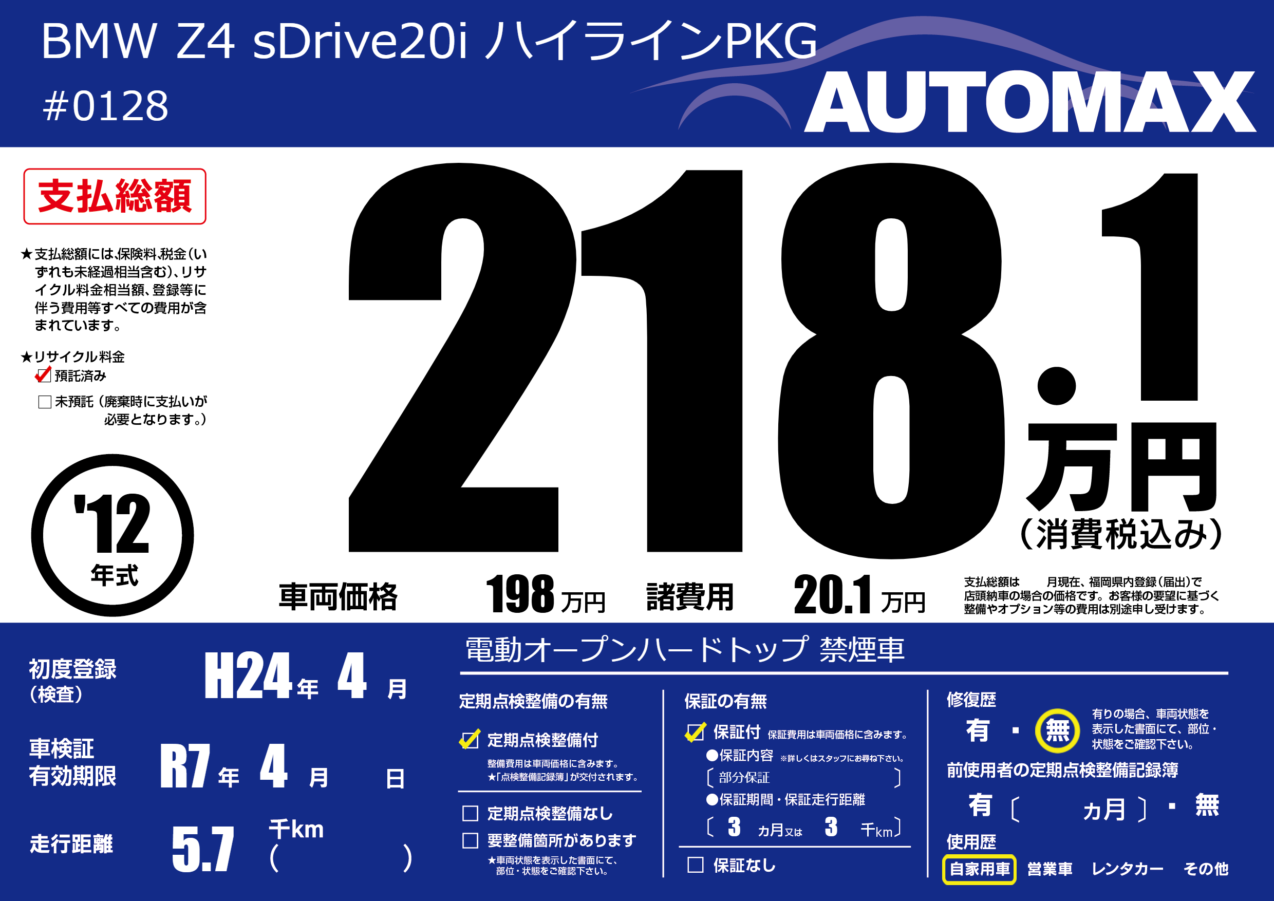 | 車名 | BMW Z4 sDrive20i ハイラインPKG | グレード ミッション 排気量 |