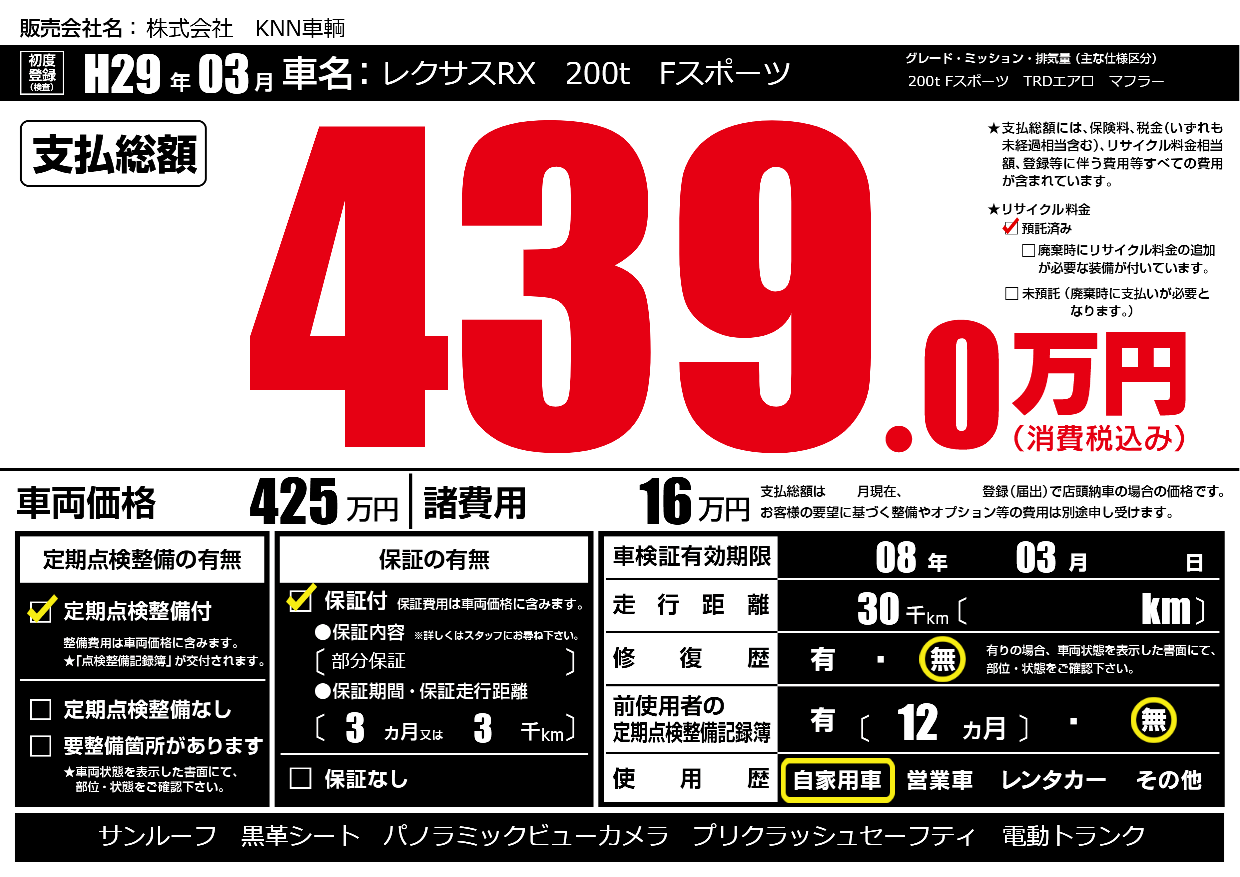 | 車名 | レクサスRX 200t Fスポーツ | グレード ミッション 排気量 |