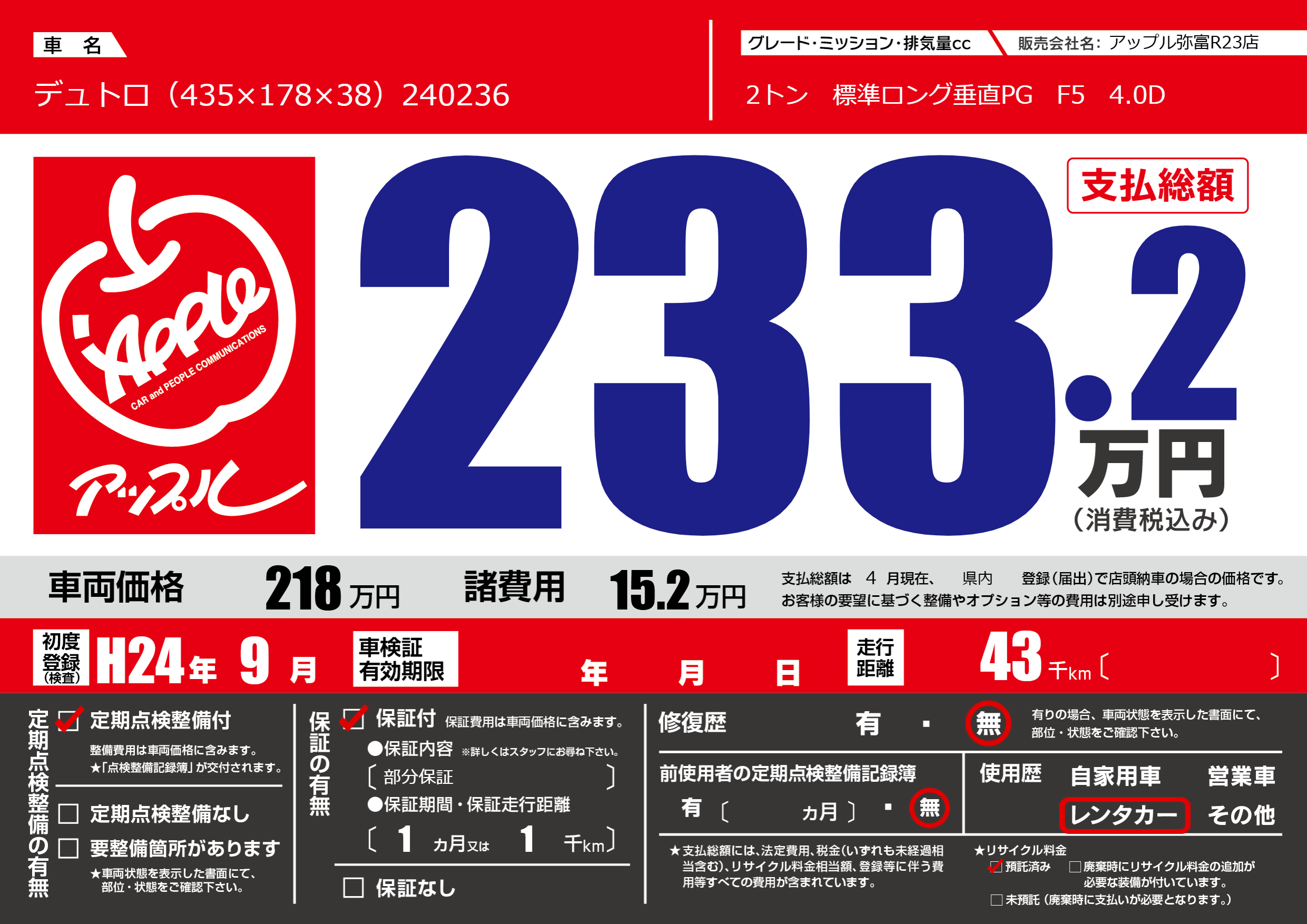 | 車名 | デュトロ(435×178×38)240236 | グレード ミッション 排気量 |