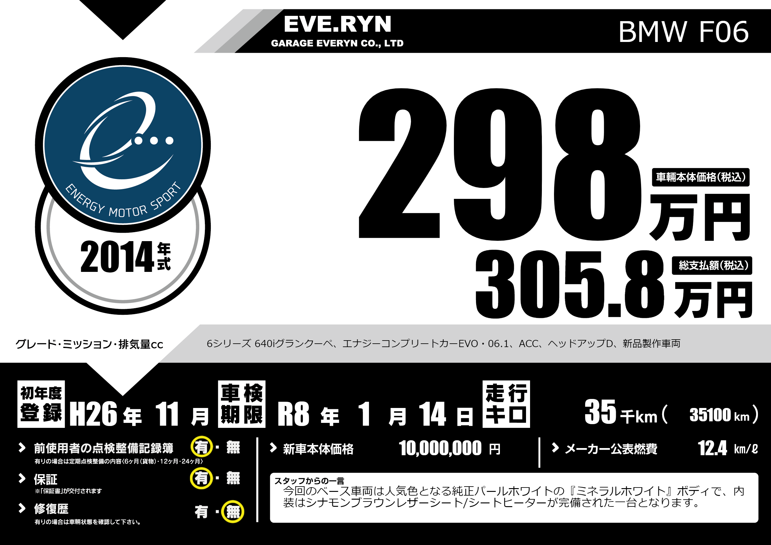 6シリーズ 640iグランクーペ、エナジーコンプリートカーEVO・06.1、ACC、ヘッドアップD、新品製作車両 |