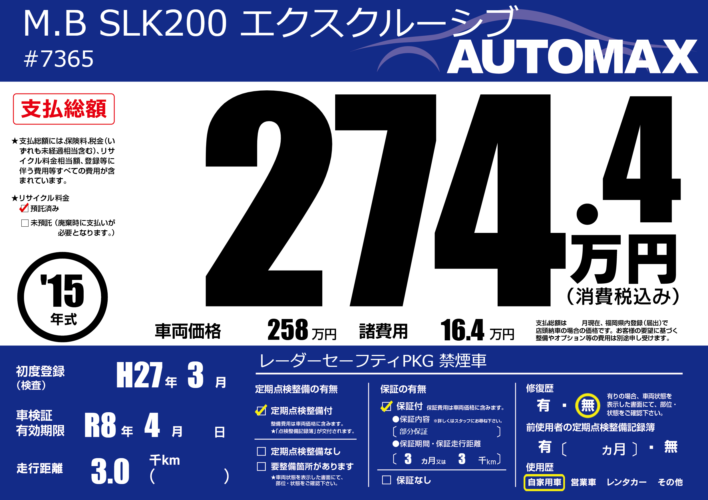 | 車名 | M.B SLK200 エクスクルーシブ | グレード ミッション 排気量 |