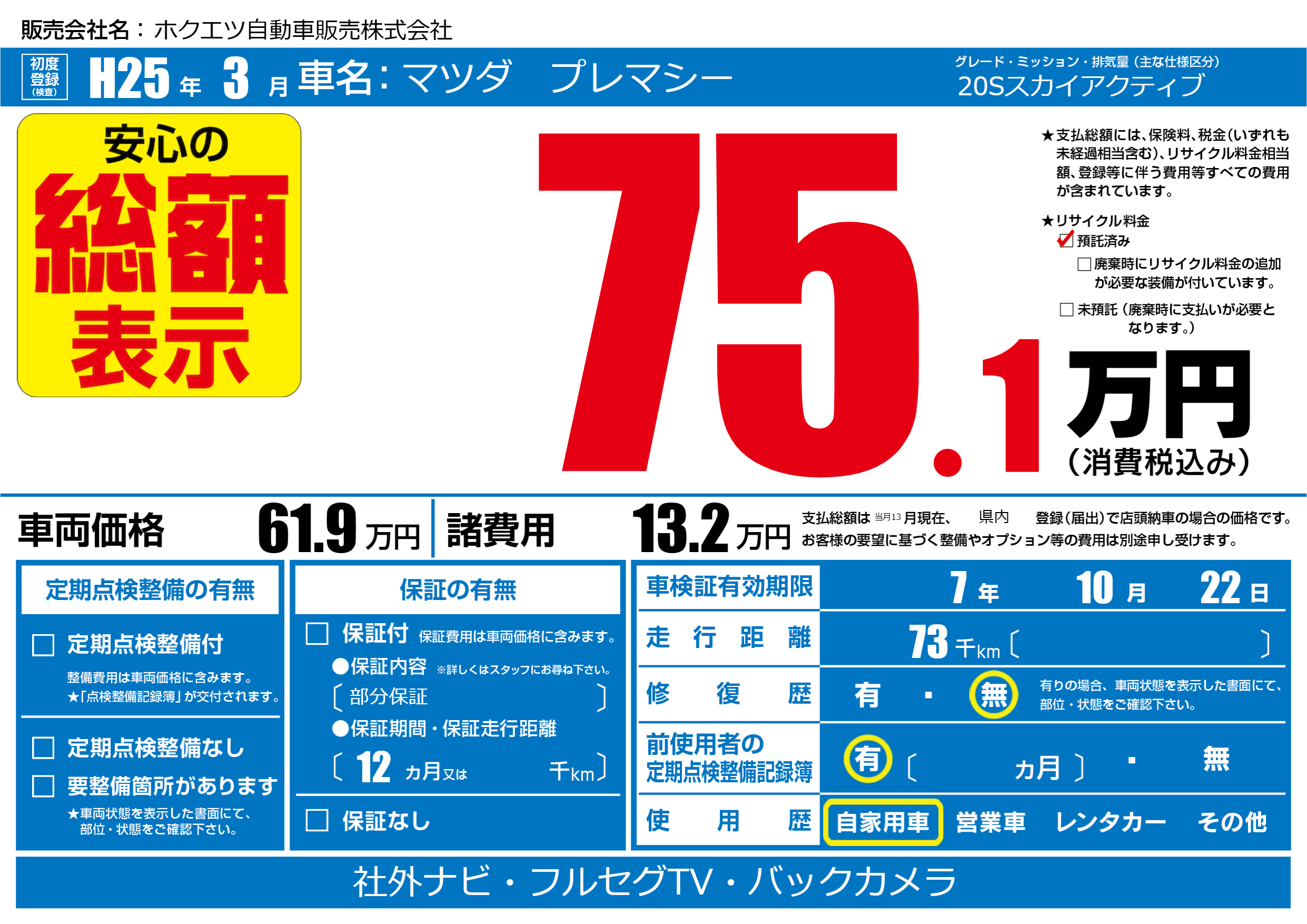 | 走行キロ | 7.3万km | 初年度登録 | H25年3月 |