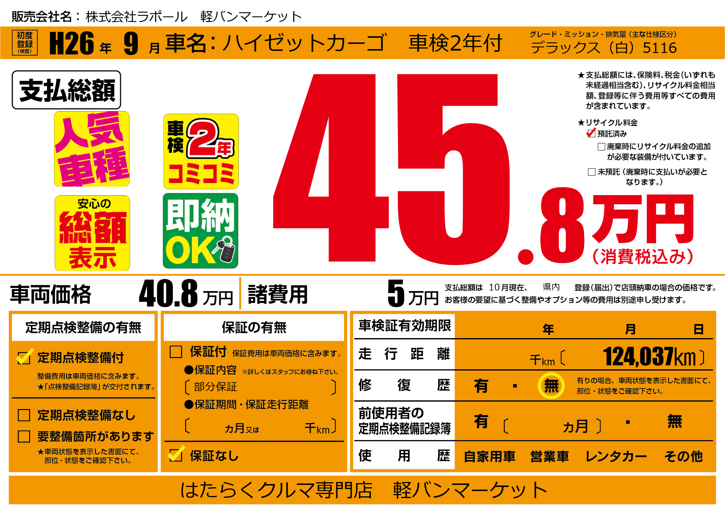| 走行キロ | - | 初年度登録 | H26年9月 |