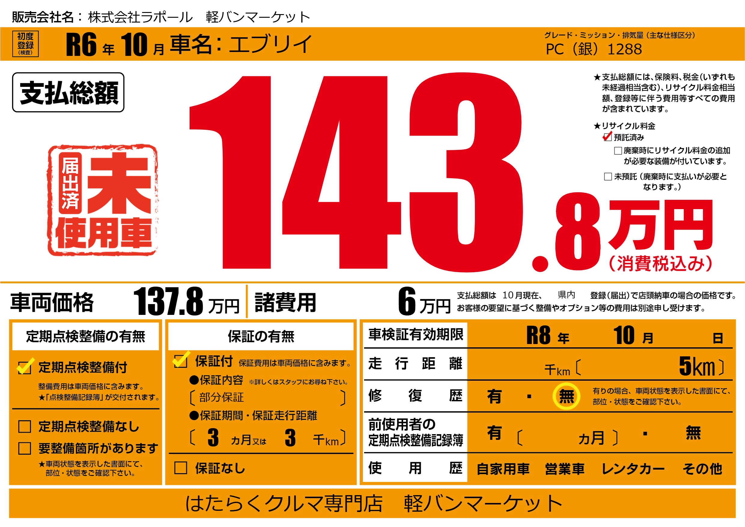| 走行キロ | - | 初年度登録 | R6年10月 |