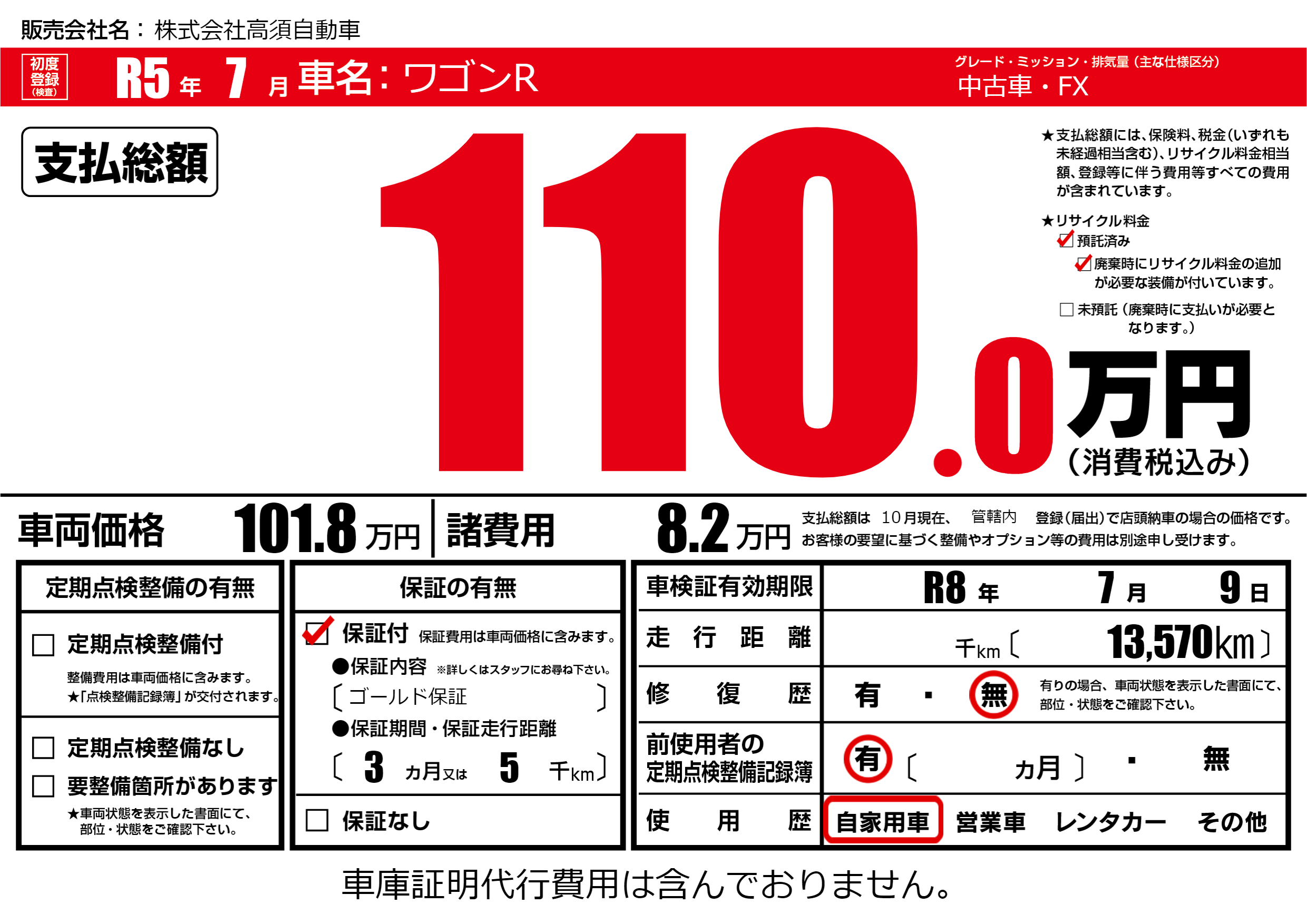 | 車名 | ワゴンR | グレード ミッション 排気量 |