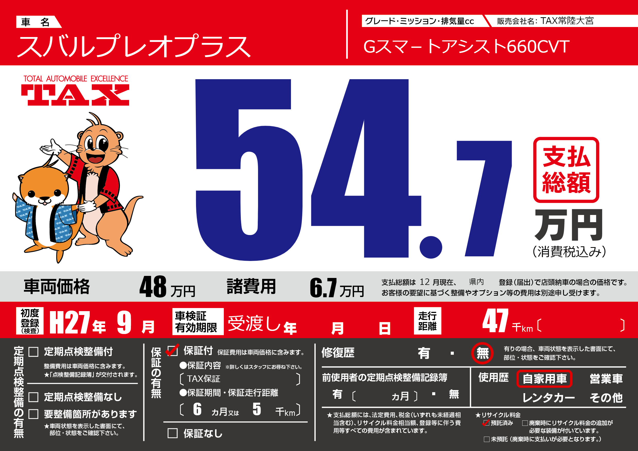 保証付き 保証内容(TAX保証) 6ヶ月または(5)千kmまで |