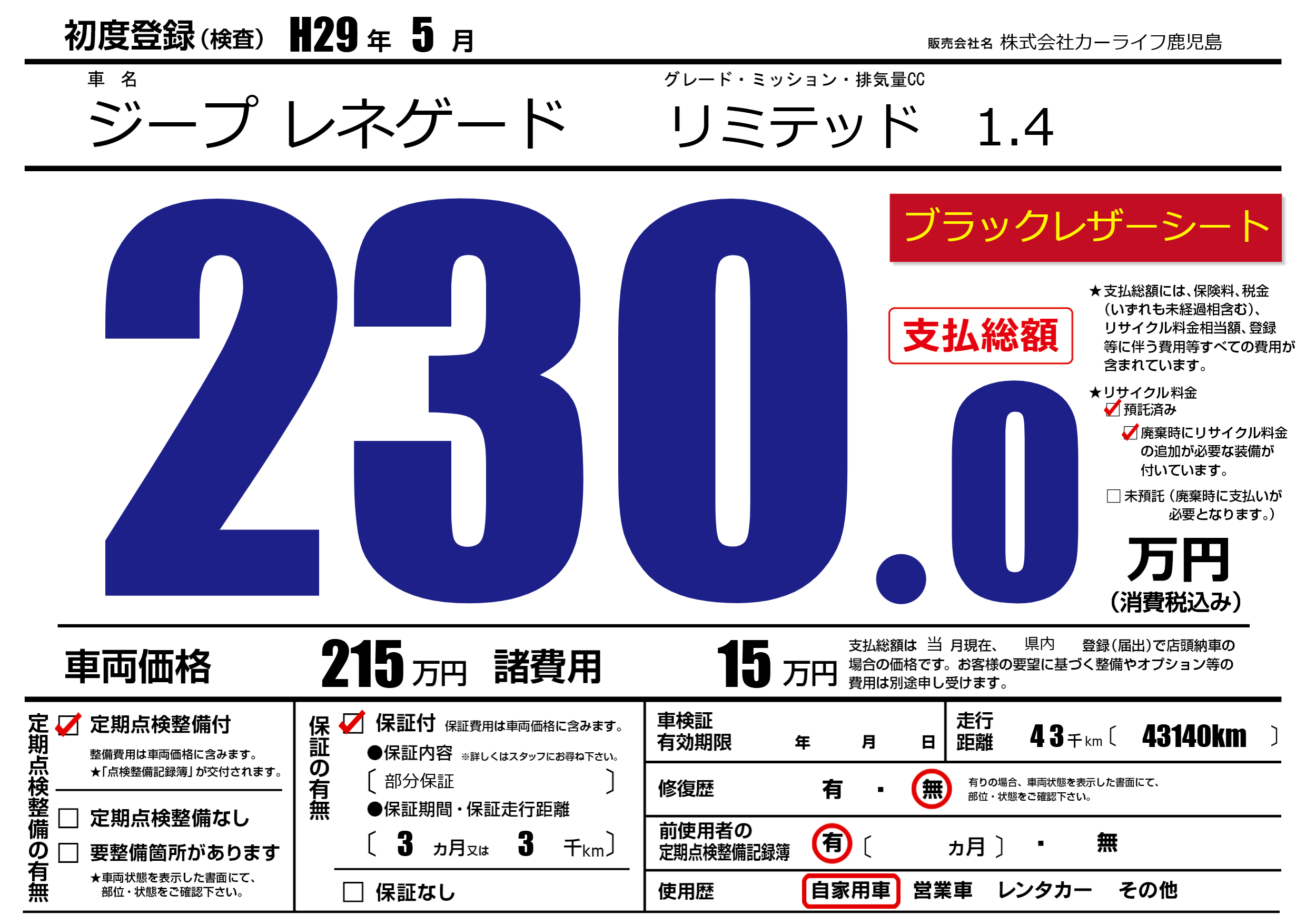 | 車名 | ジープ レネゲード | グレード ミッション 排気量 |