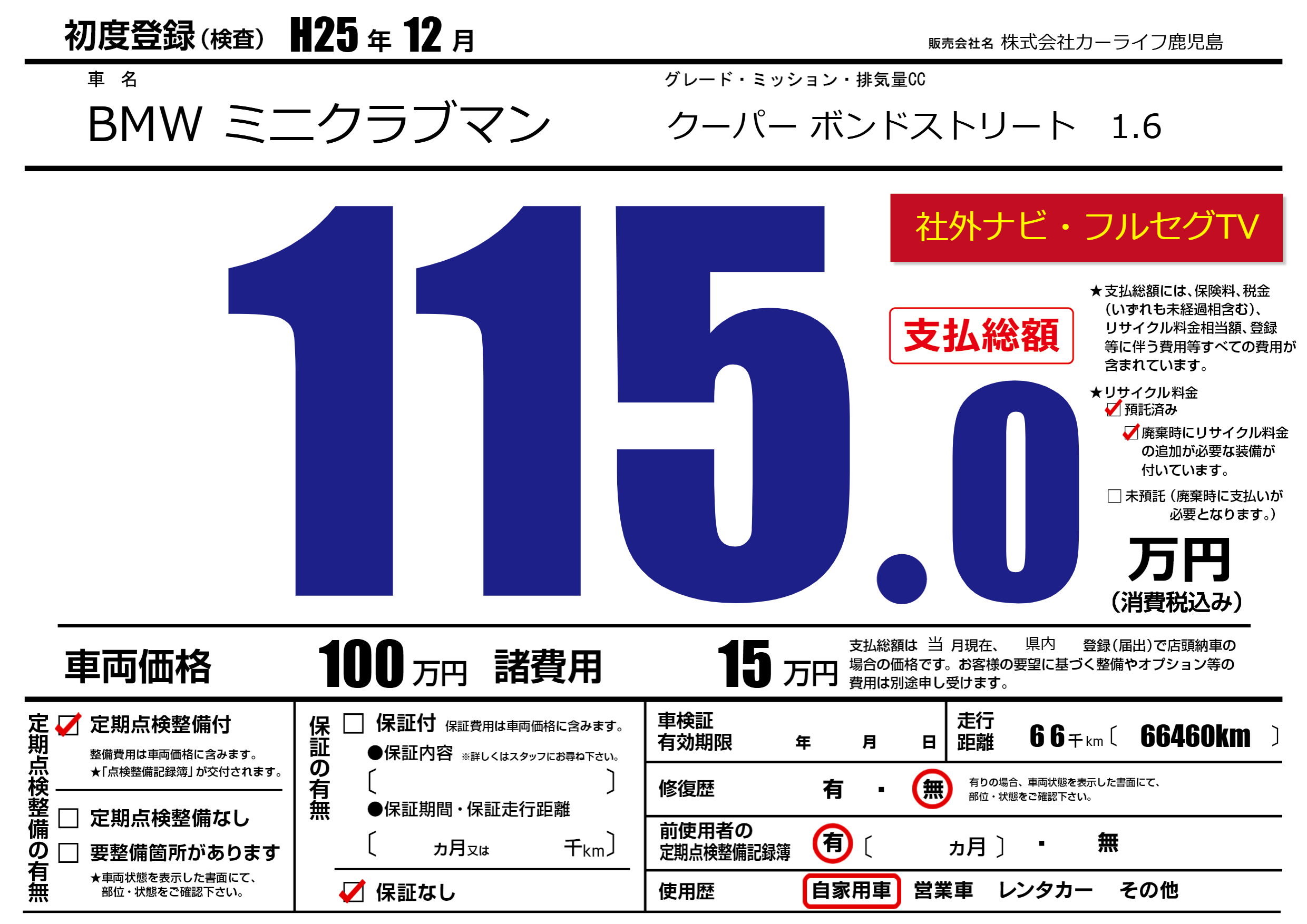| 車名 | BMW ミニクラブマン | グレード ミッション 排気量 |