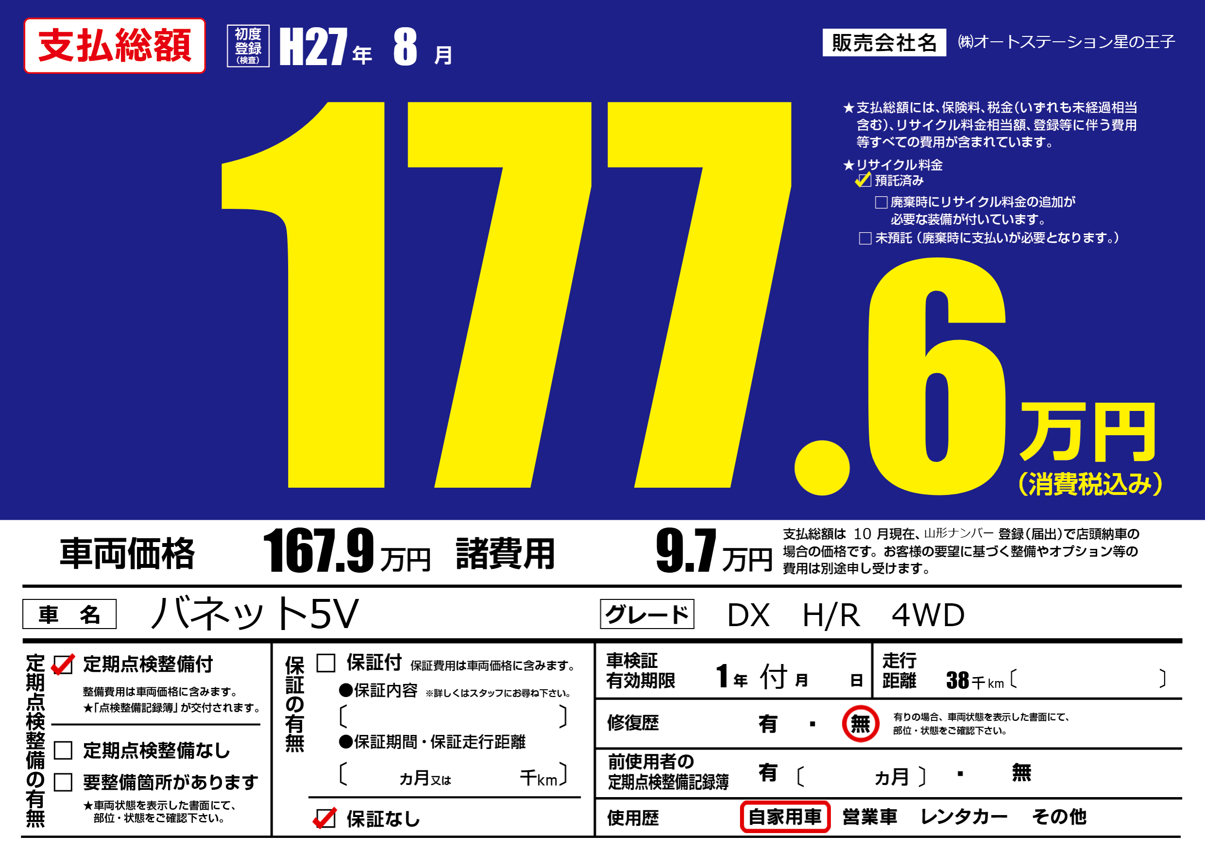 | 走行キロ | 3.8万km | 初年度登録 | H27年8月 |