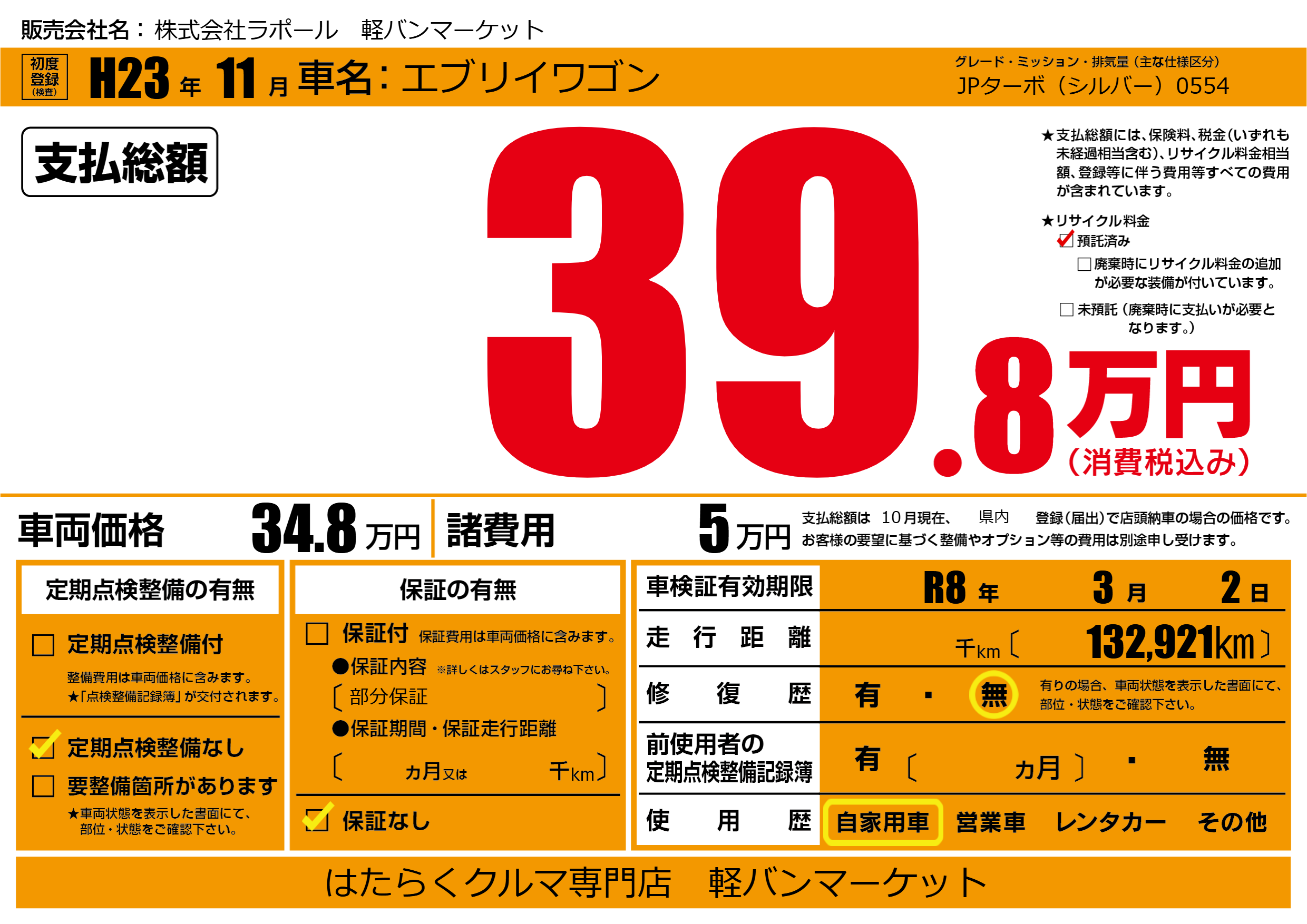 なし | 車検制限 | R8年3月2月 |