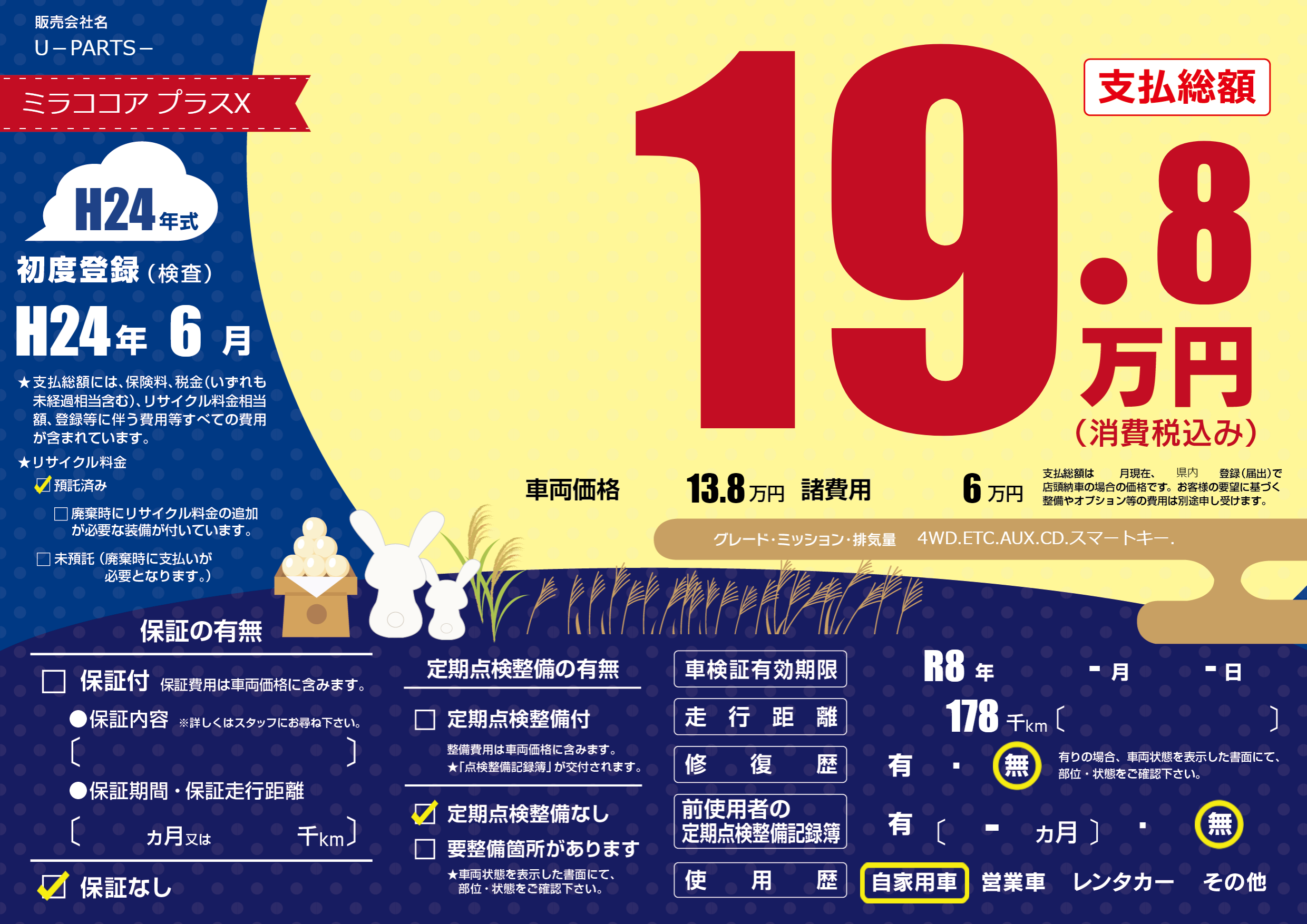 | 走行キロ | 17.8万km | 初年度登録 | H24年6月 |