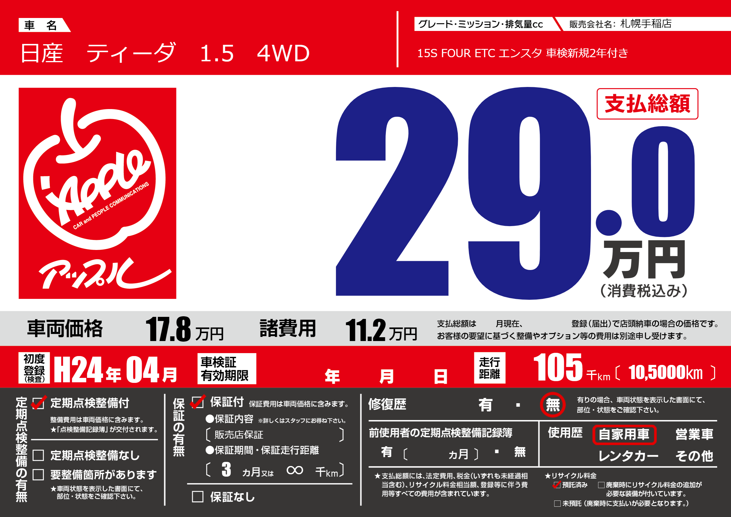 | 車名 | 日産 ティーダ 1.5 4WD | グレード ミッション 排気量 |