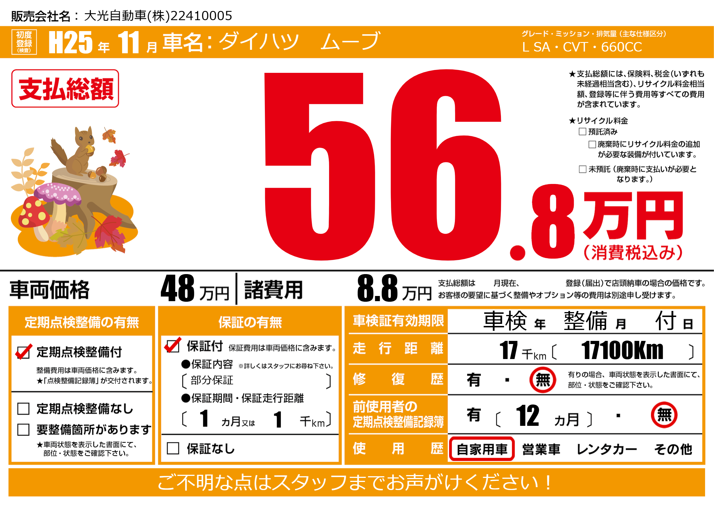 | 走行キロ | 1.7万km | 初年度登録 | H25年11月 |