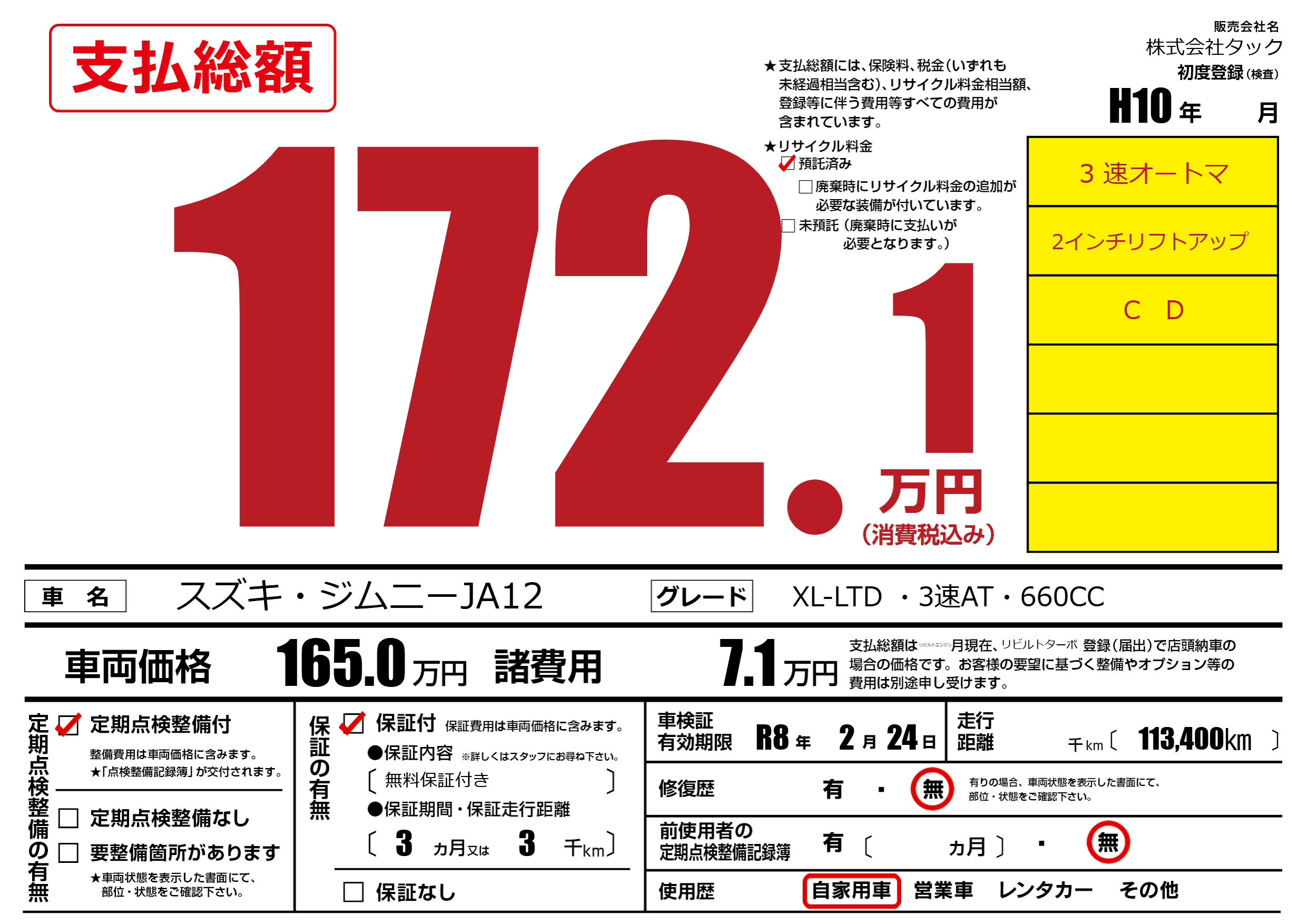 | 車名 | スズキ・ジムニーJA12 | グレード ミッション 排気量 |