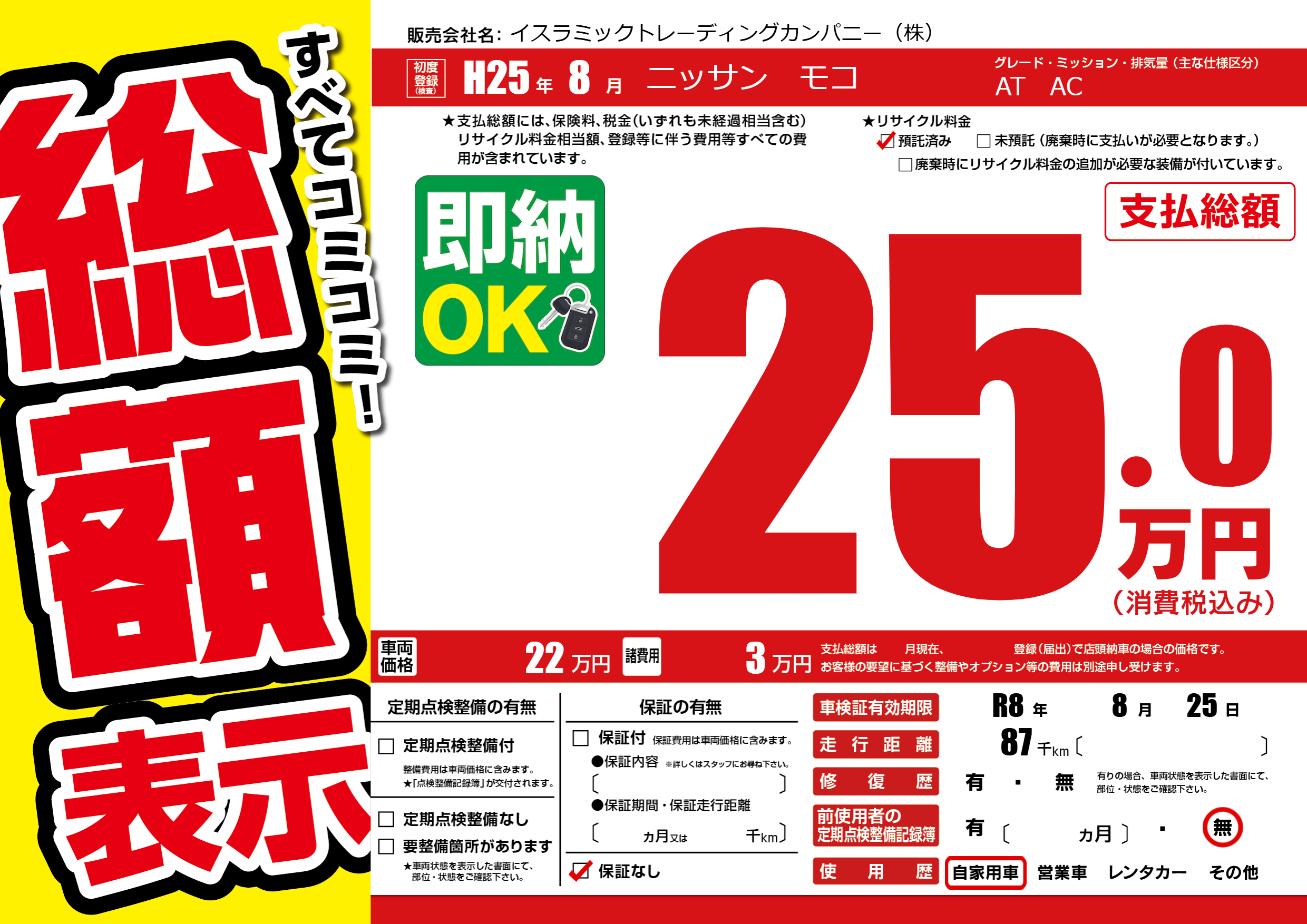 | 走行キロ | 8.7万km | 初年度登録 | H25年8月 |