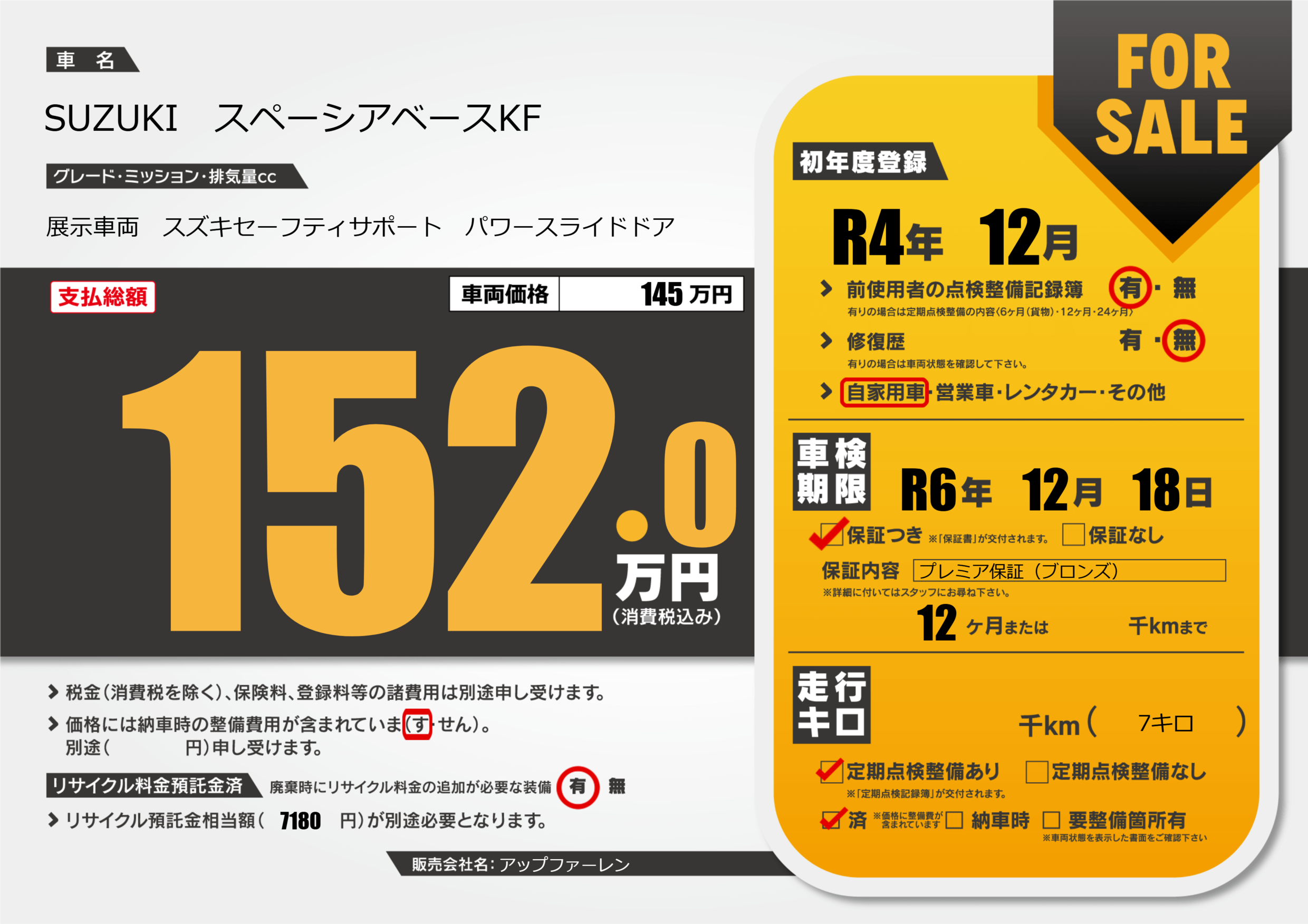 | 定期点検整備 | 定期点検整備あり 定期点検整備済み | ||