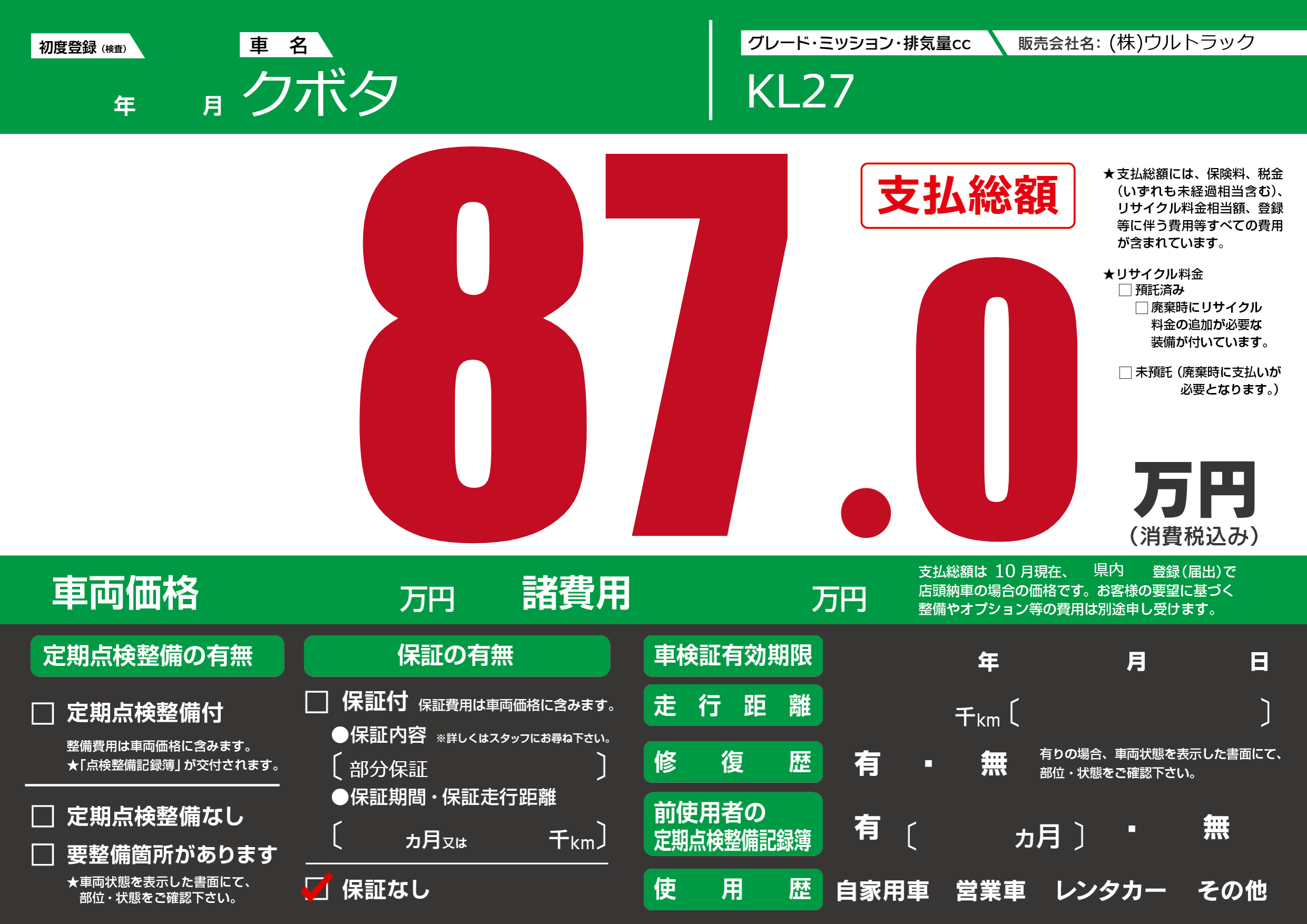 保証なし 保証内容(部分保証) ---ヶ月または()千kmまで |
