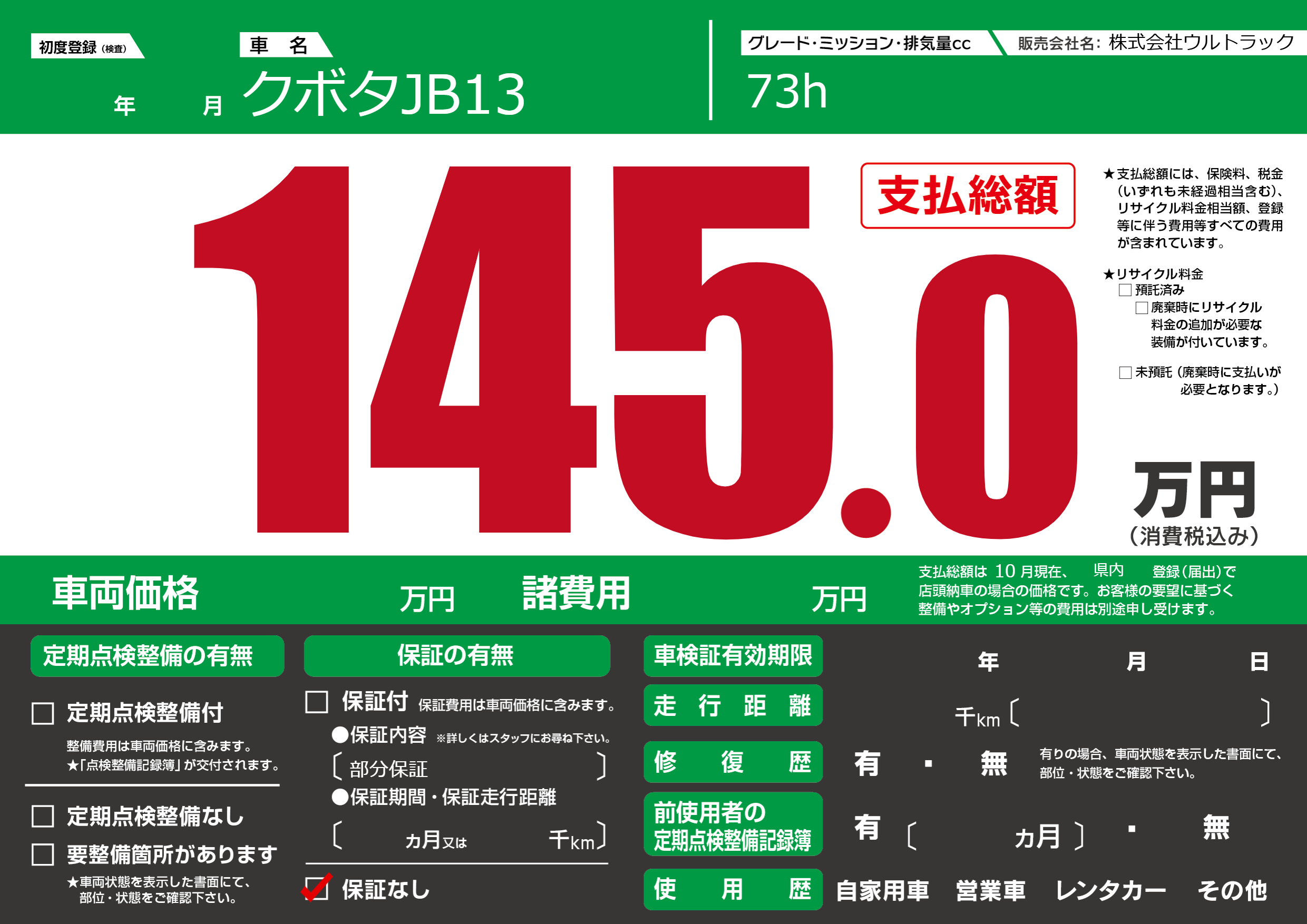 | 車名 | クボタJB13 | グレード ミッション 排気量 |