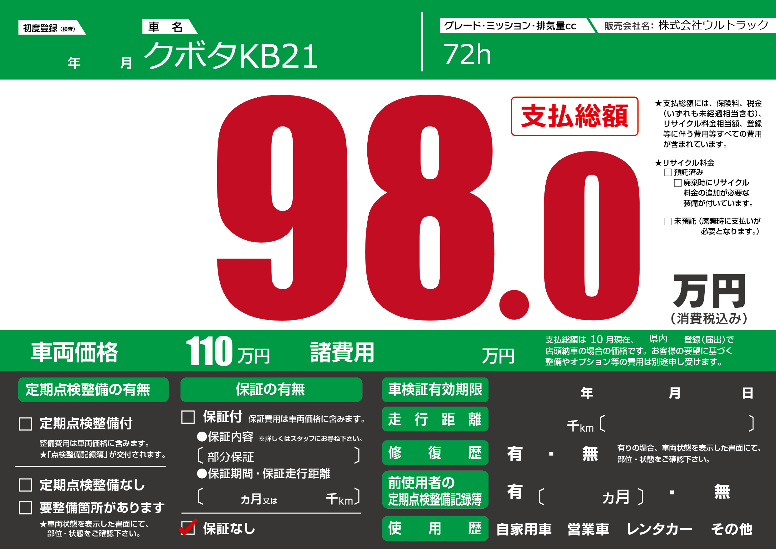 | 車名 | クボタKB21 | グレード ミッション 排気量 |